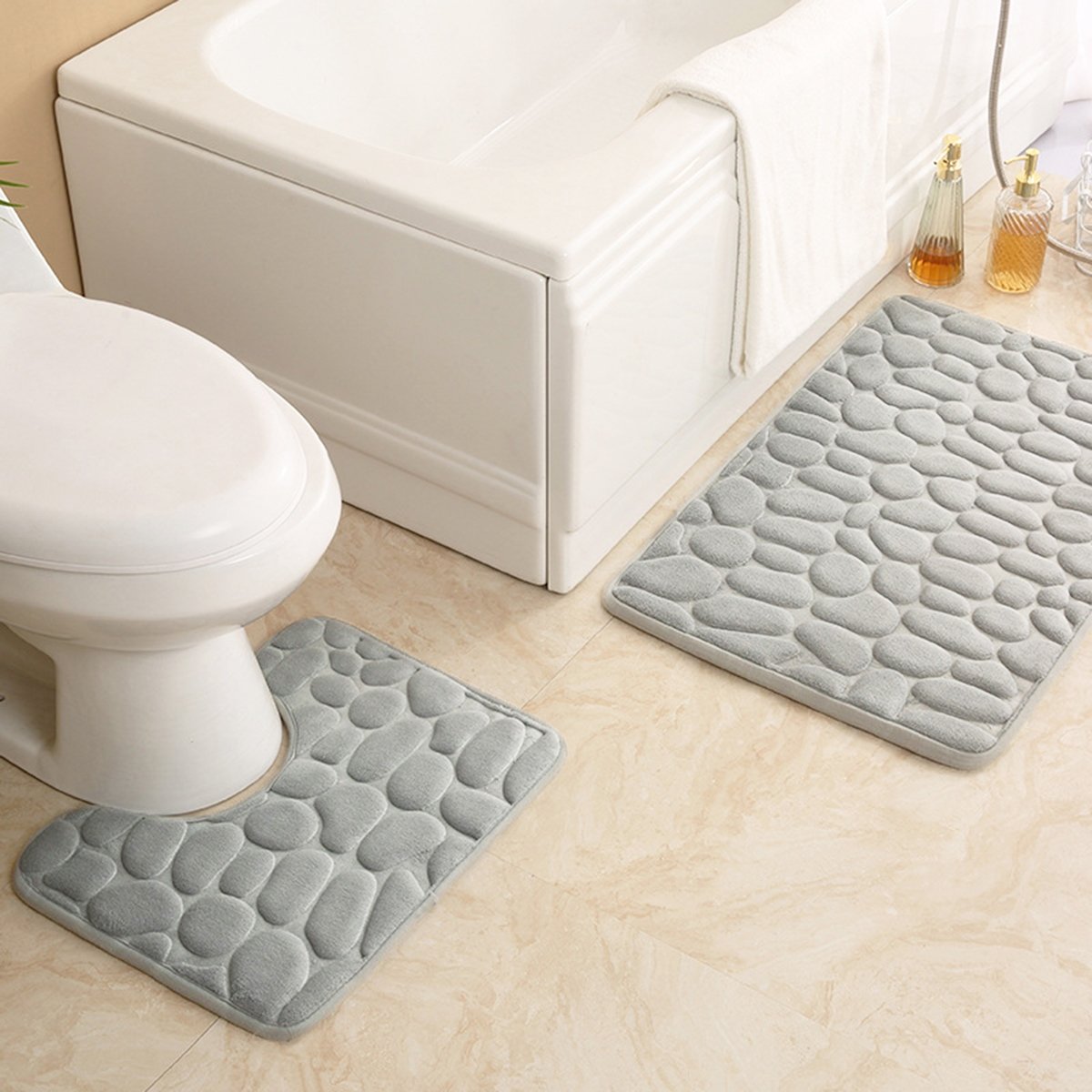 Koberečky mají mimořádně dekorativní texturu, připomínající oblázky rozptýlené na písku. Vyrobeno z jemného fleece materiálu a pěna si pamatuje tvar nohou.