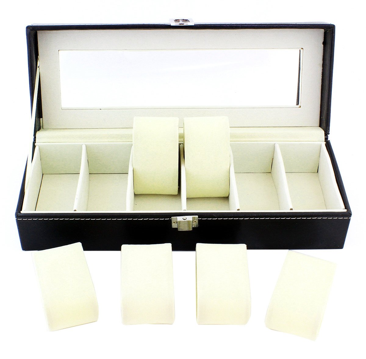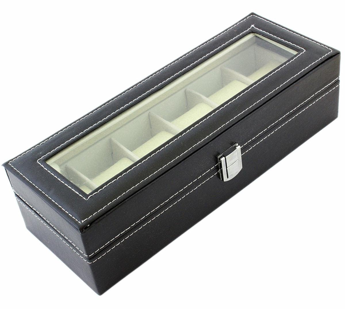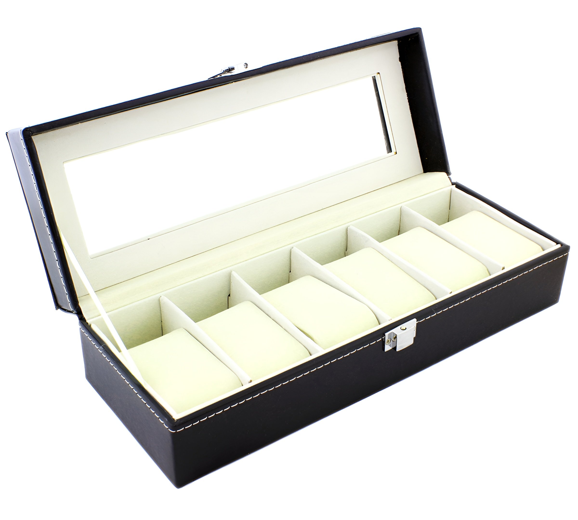 Extrémně funkční pouzdro na 6 hodinek nebo náramků. Praktický organizér na hodinky je vyroben z elegantní černé ekokůže, prošívání stříbrnou nití navíc zvyšuje atraktivitu pouzdra. Díky černé barvě se skvěle hodí do interiérů s jakýmkoliv dekorem.