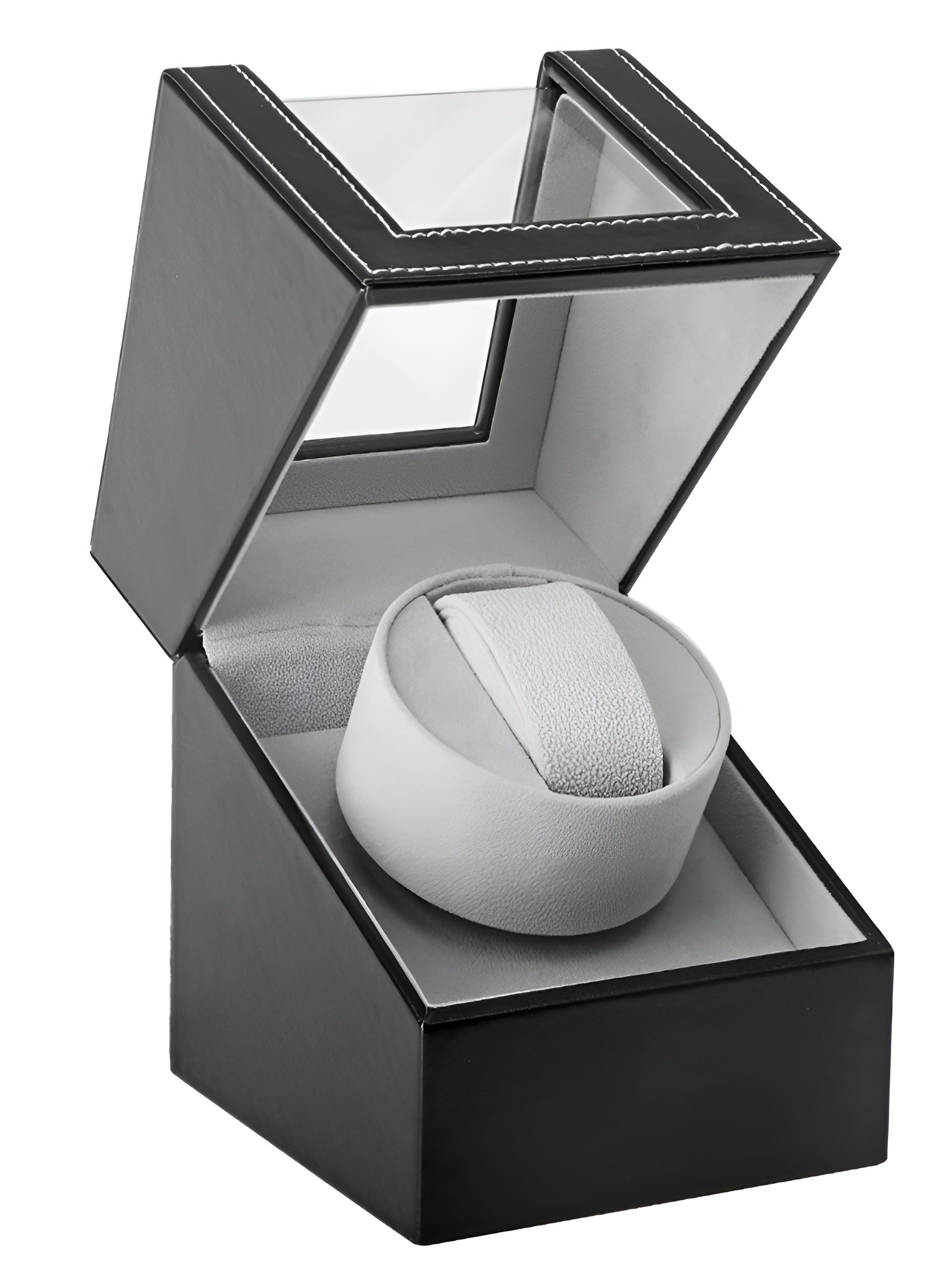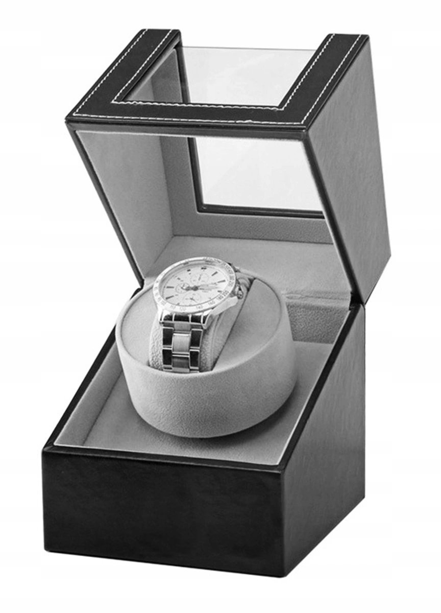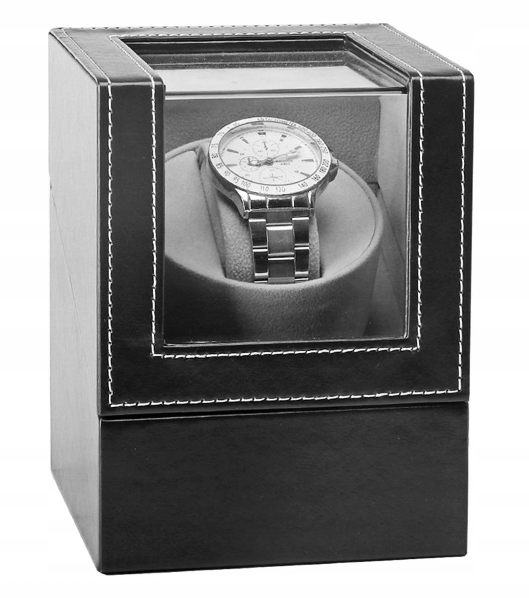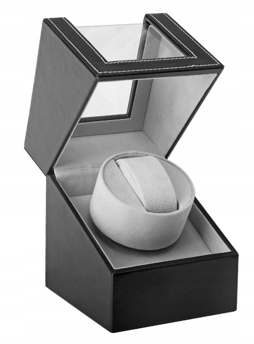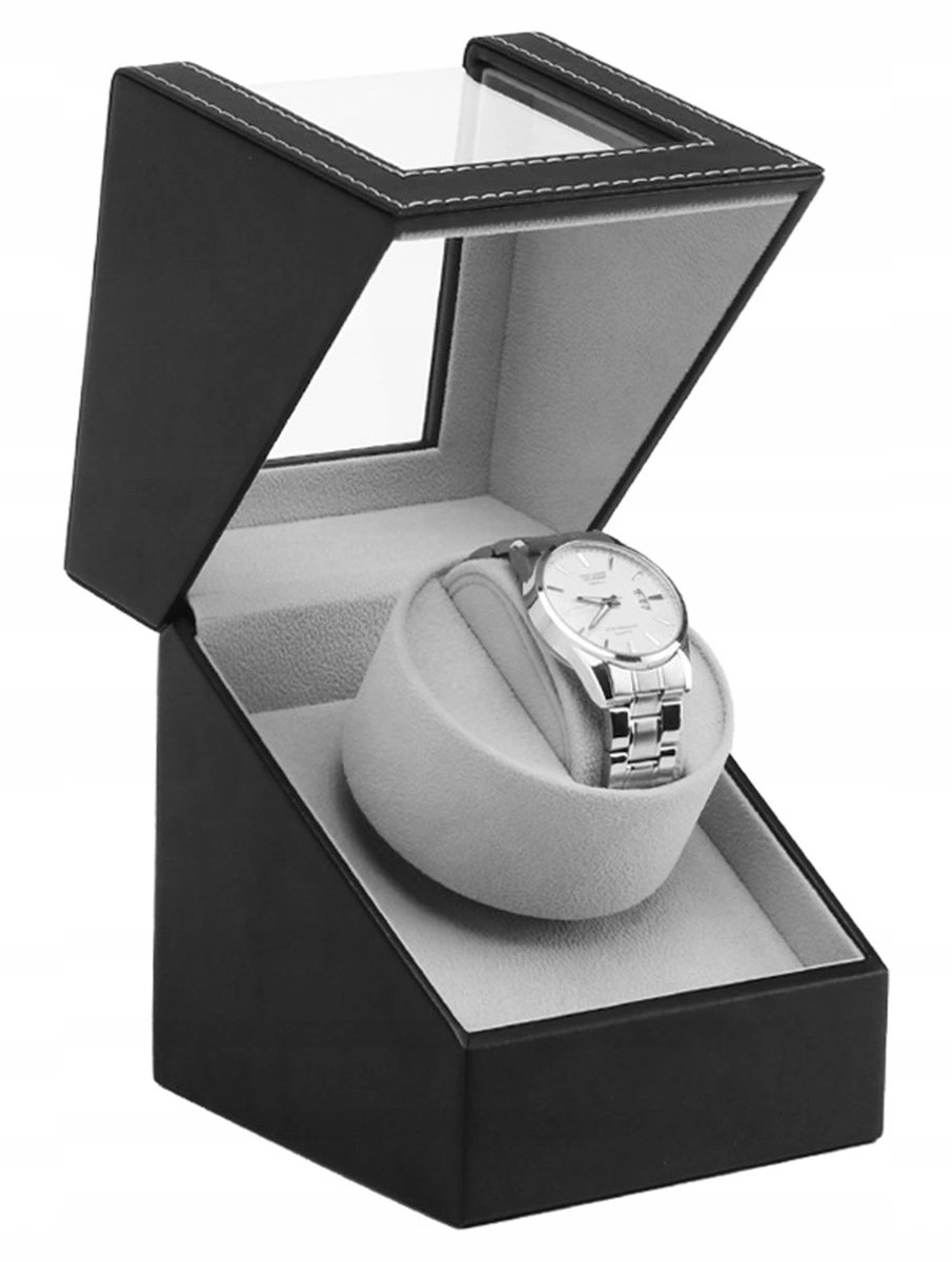 Navíječ pro automatické hodinky. Vyroben z elegantní černé ekokůže, prošití bílou nití navíc zvyšuje atraktivitu pouzdra. Díky černé barvě se perfektně hodí do každého interiéru. Zařízení umožňuje automatické natahování hodinek s automatickým nátahem, nahrazující pohyby zápěstí.