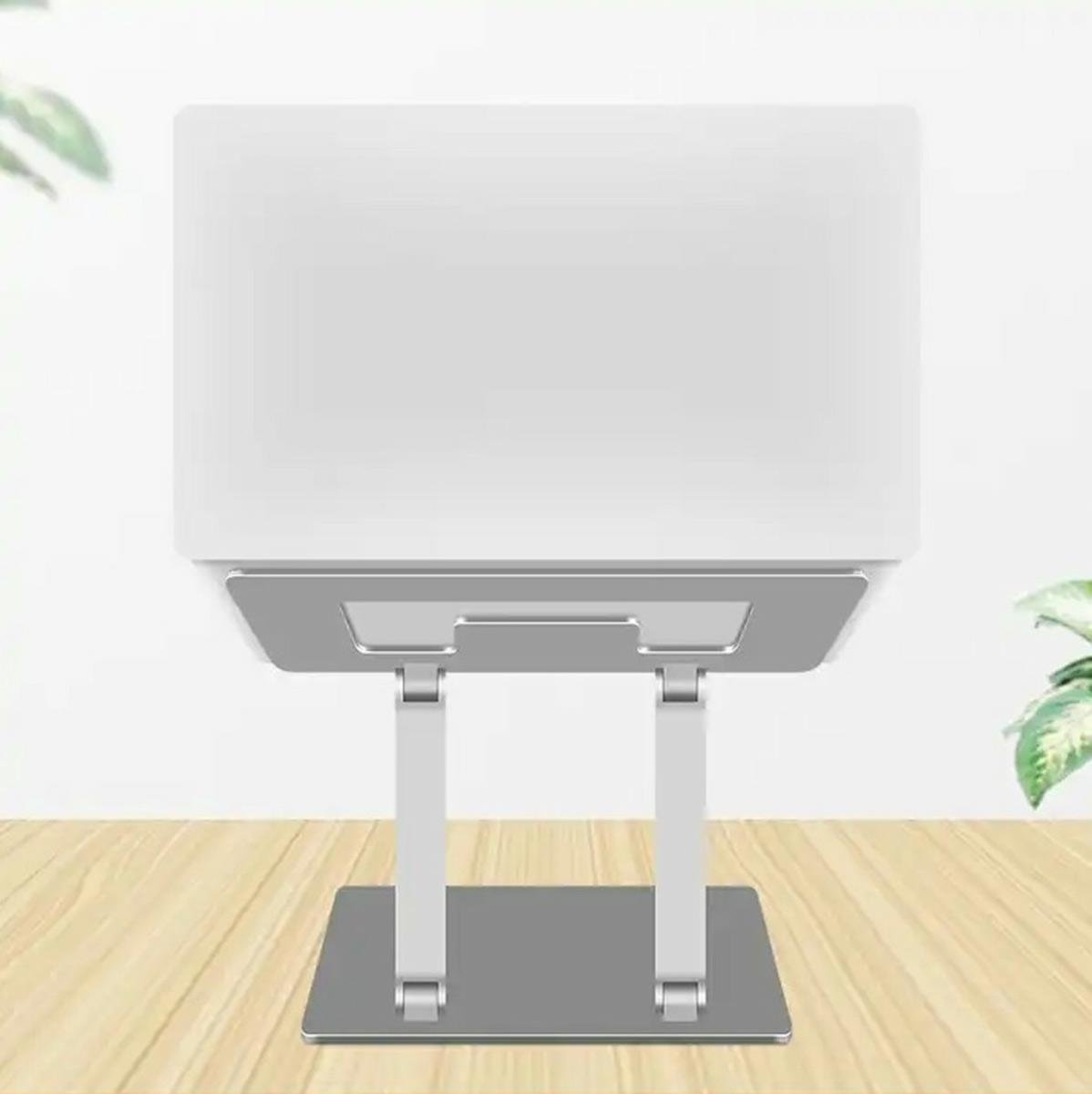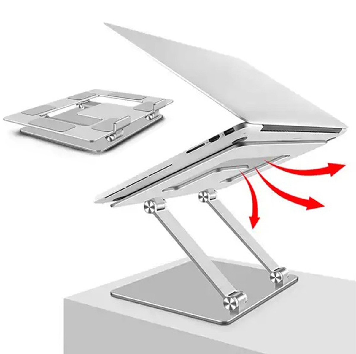 Hliníkový, skládací stojan na notebook. Vyznačuje se lehkou a pevnou konstrukcí s mimořádnou ergonomií. Umožňuje pohodlné používání notebooku i vleže. Vícestupňové nastavení sklonu desky stolu umožňuje přizpůsobení stolu potřebám uživatele. Jedná se o extrémně ergonomické řešení, které zvyšuje komfort používání notebooku. Nastavitelná ramena umožňují umístit na stojan menší zařízení, jako jsou tablety a smartphony. Silikonové podložky na spodní straně zabraňují sklouznutí stojanu a případnému poškrábání.