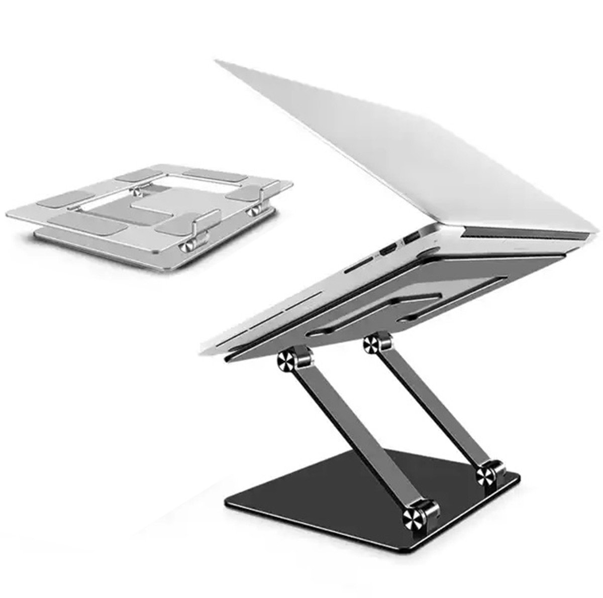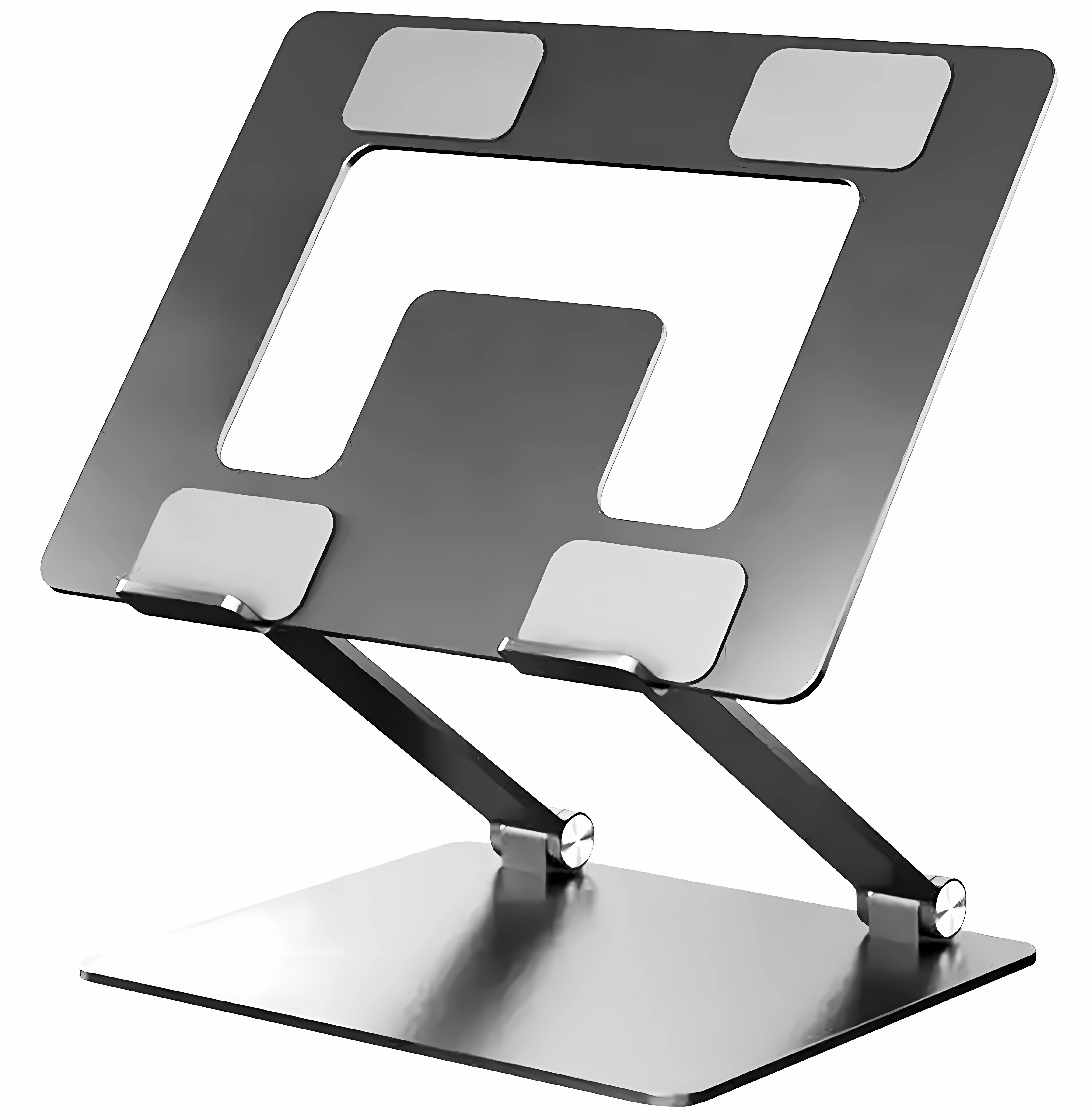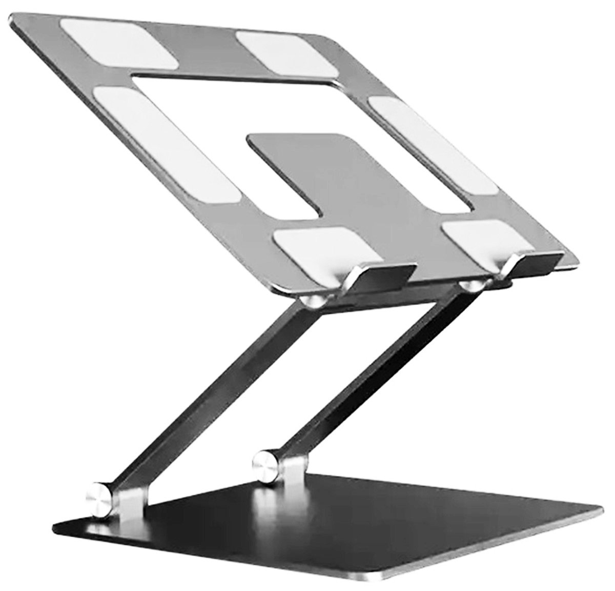 Hliníkový, skládací stojan na notebook. Vyznačuje se lehkou a pevnou konstrukcí s mimořádnou ergonomií. Umožňuje pohodlné používání notebooku i vleže. Vícestupňové nastavení sklonu desky stolu umožňuje přizpůsobení stolu potřebám uživatele. Jedná se o extrémně ergonomické řešení, které zvyšuje komfort používání notebooku. Nastavitelná ramena umožňují umístit na stojan menší zařízení, jako jsou tablety a smartphony. Silikonové podložky na spodní straně zabraňují sklouznutí stojanu a případnému poškrábání.