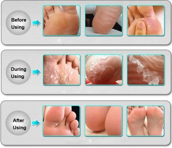 Po uplynutí této doby odstraňte masky, nohy důkladně opláchněte čistou vodou bez čisticích prostředků. Nepoužívejte škrabky, pemzy.