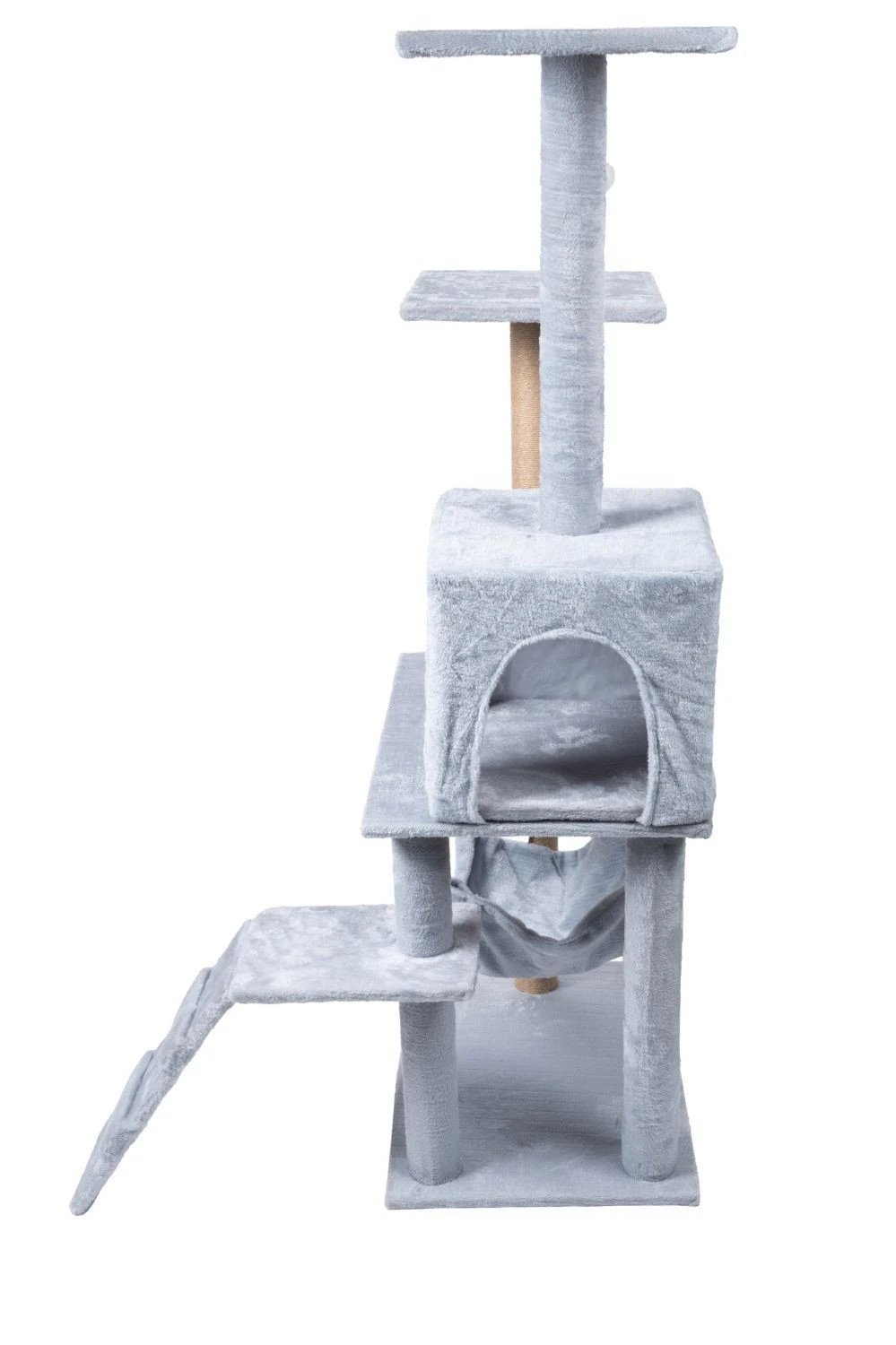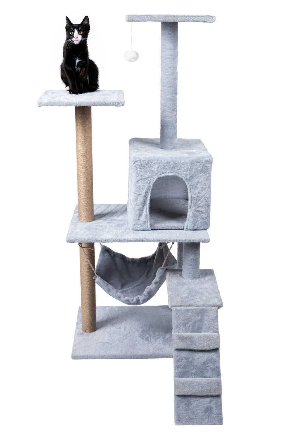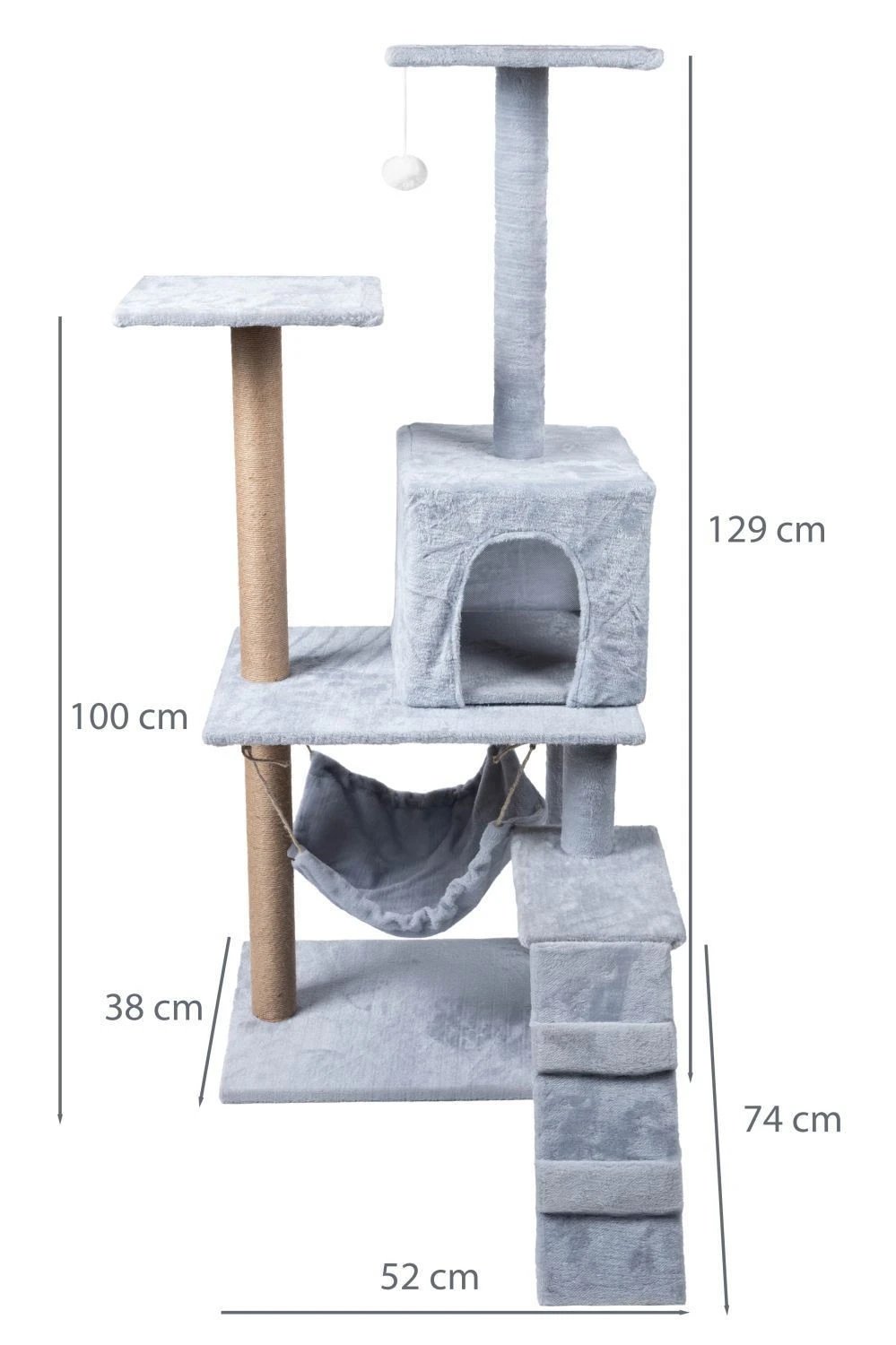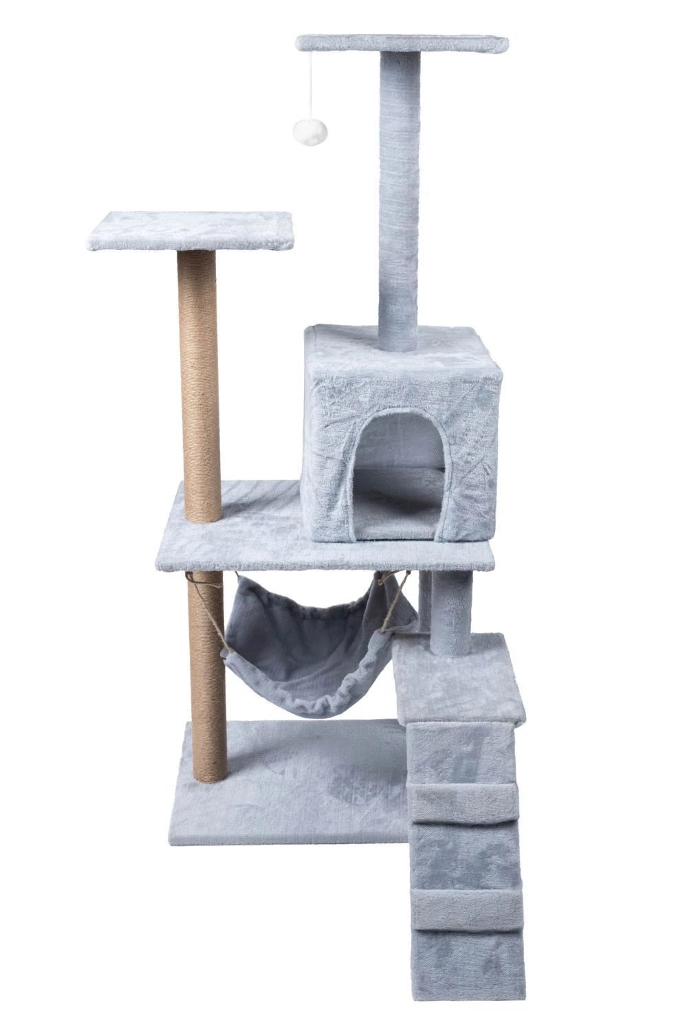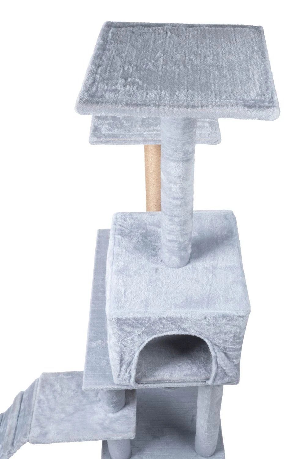 Stabilní škrabadlo pro kočky s domkem, pelíškem, 2 plošinami a schůdky. 4 úrovně, šedé.