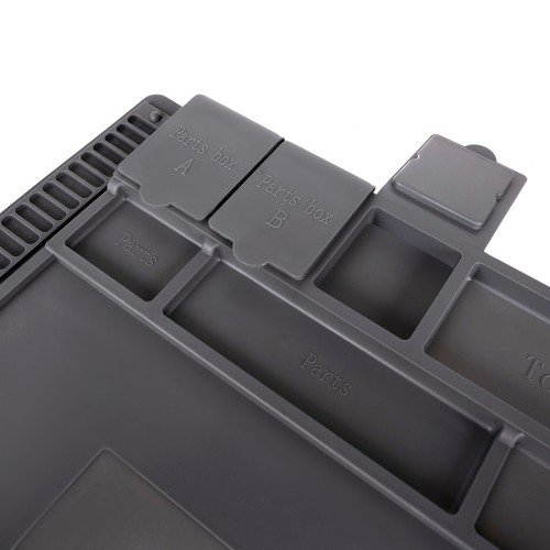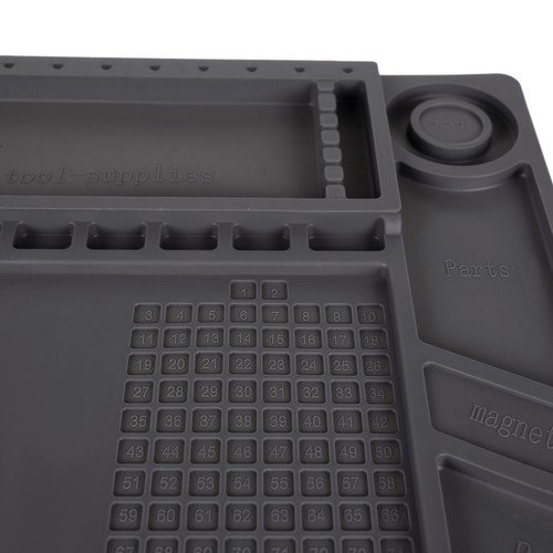 Multifunkční silikonová servisní podložka je nutností pro každého amatérského i profesionálního kutila. Velmi usnadňuje provádění všech elektronických oprav a pájení. Odolné vůči vysokým teplotám (až 500 stupňů Celsia) a deformacím. Má 4 magnetické body: pro magnetizační šroubováky, pro díly a šrouby, stejně jako četné přihrádky a lineární stupnici v centimetrech a palcích.