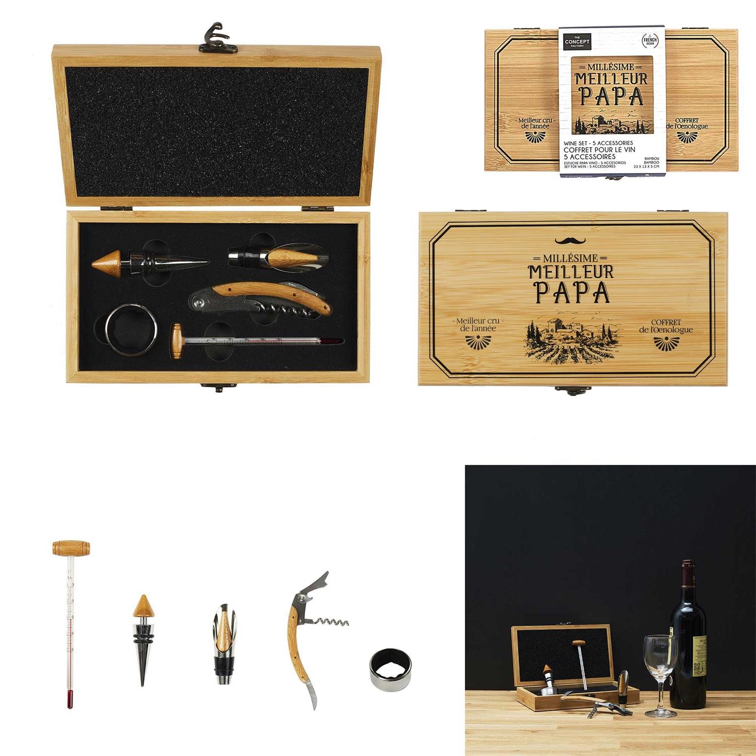 Elegantní dárkový set na víno je ideálním dárkem pro každého milovníka vín. Sada obsahuje 5 praktických doplňků v dřevěném boxu s nápisem „Millésime Meilleur Papa“, což z ní dělá skvělý tip na dárek pro tatínky.