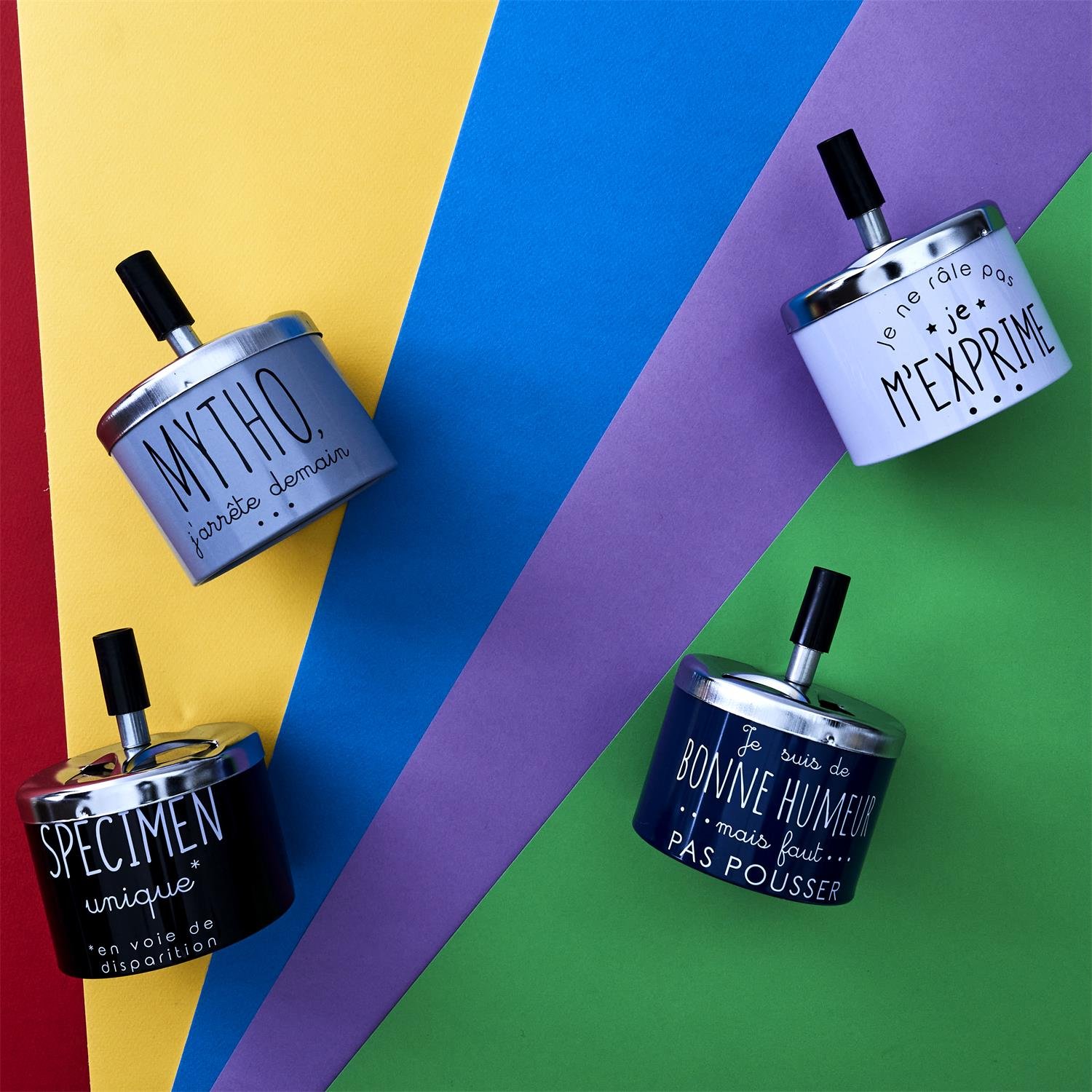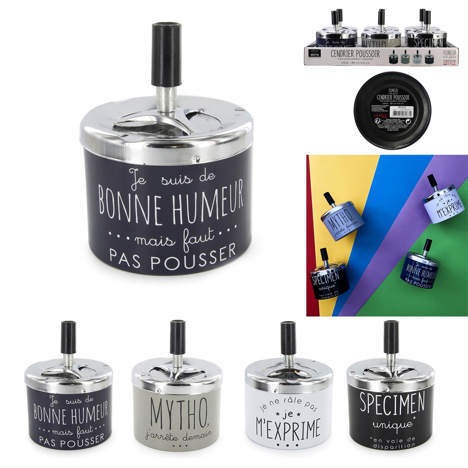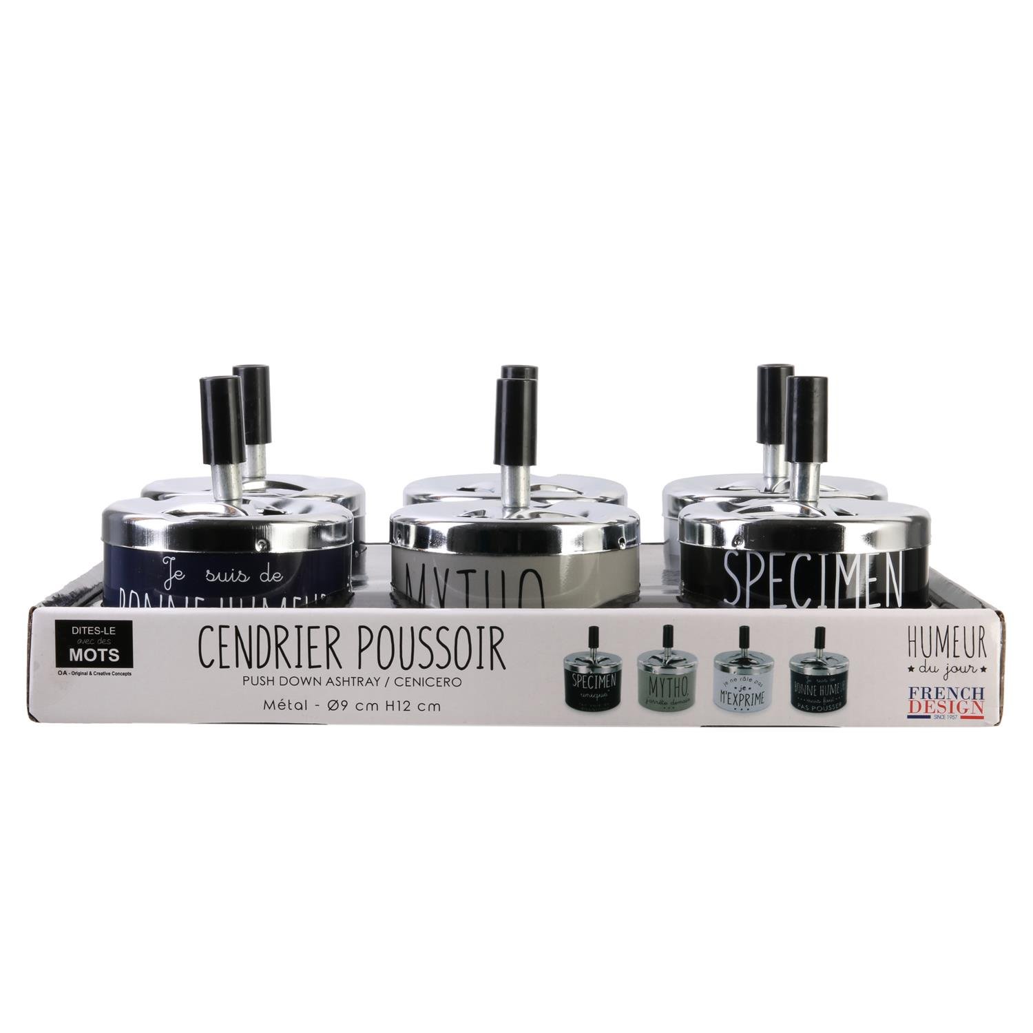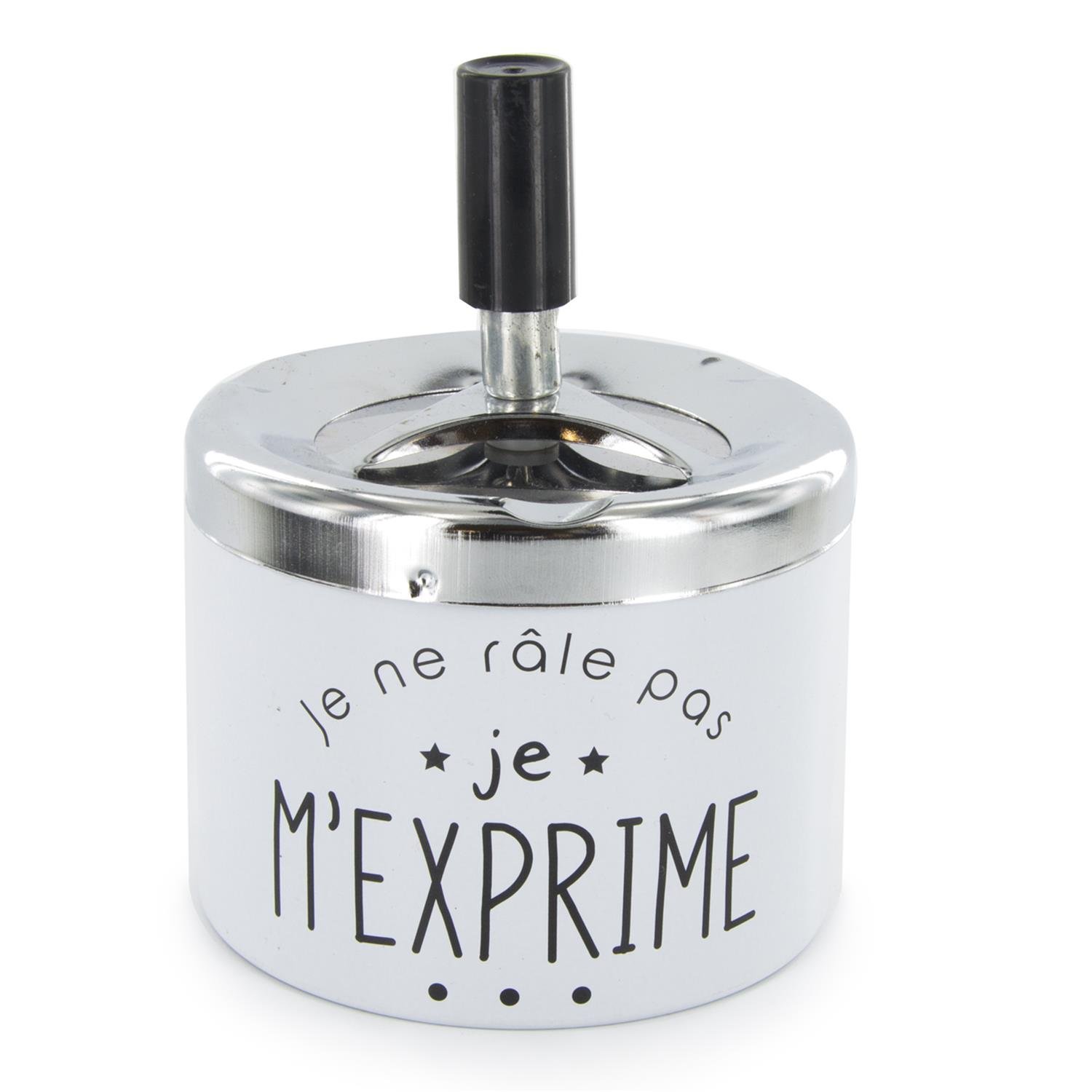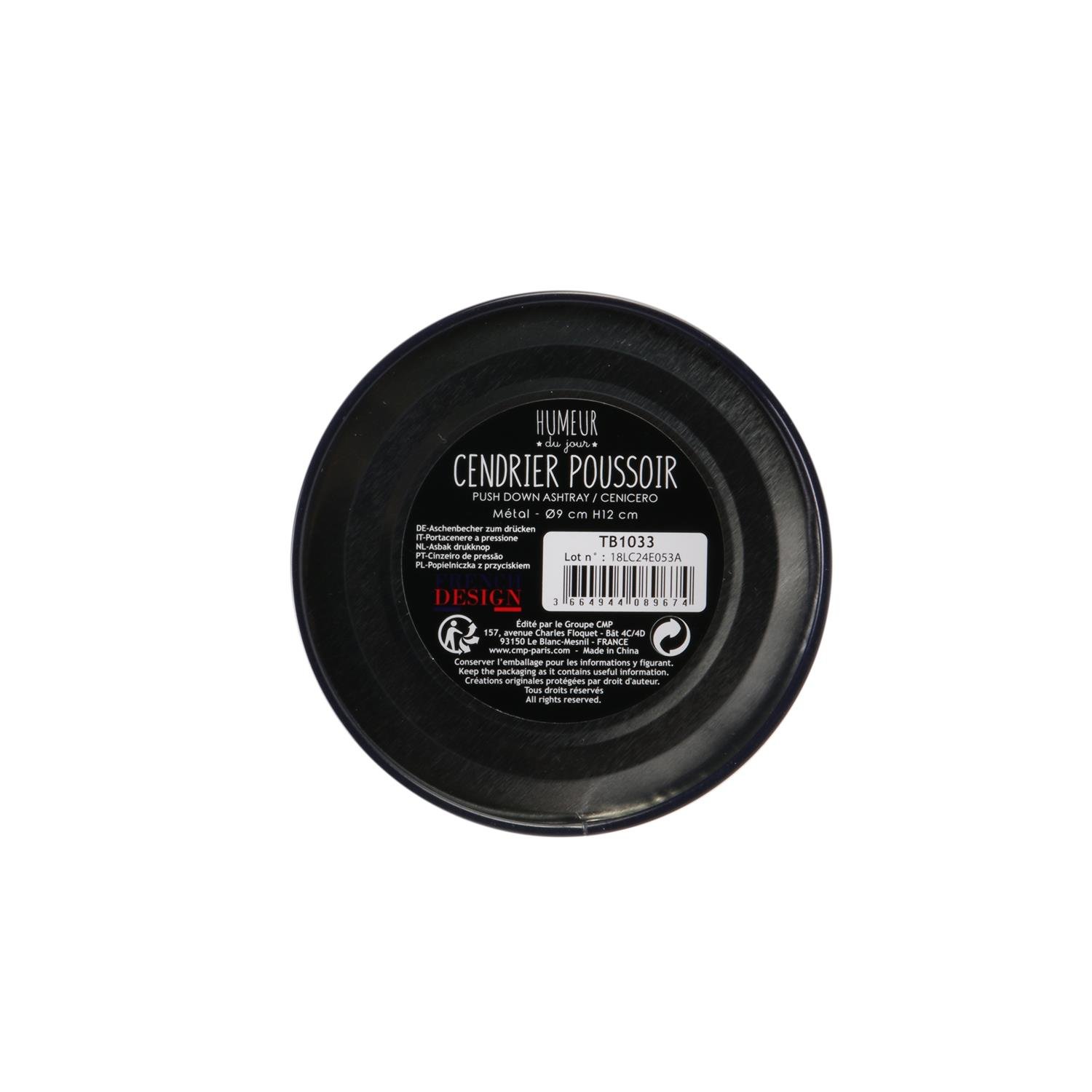Oživte svůj interiér nebo kuřácký koutek originálním kovovým popelníkem s humorným francouzským nápisem! Tento stylový „cendrier poussoir“ (popelník s tlačítkem) je nejen praktickým doplňkem, ale i veselým prvkem, který potěší každého milovníka vtipného designu. Ideální jako dárek nebo stylová dekorace.