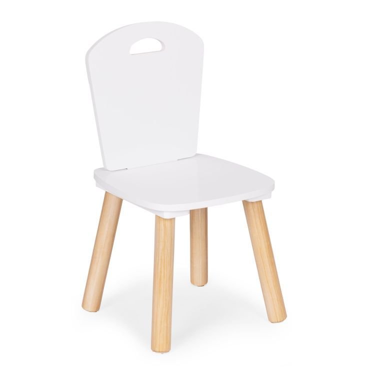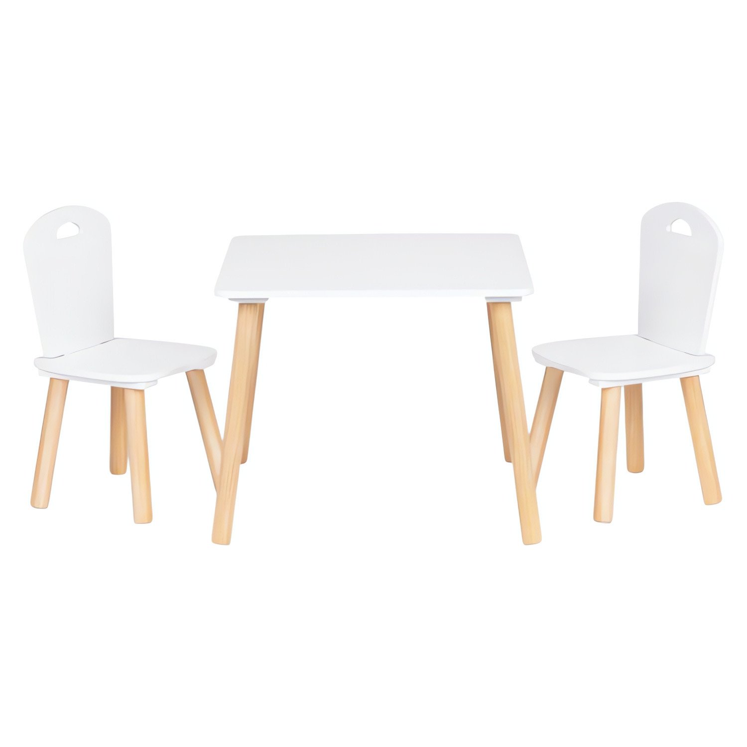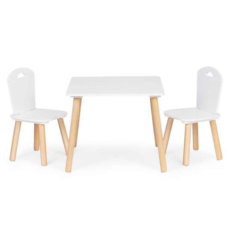 Stylová dětská sada nábytku obsahuje 1 dětský stůl a 2 židle v moderním bílém provedení s přírodními dřevěnými nohami.
