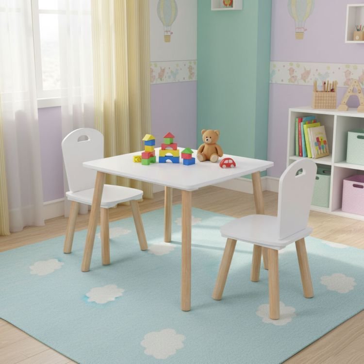 Stylová dětská sada nábytku obsahuje 1 dětský stůl a 2 židle v moderním bílém provedení s přírodními dřevěnými nohami. Sada je navržena tak, aby poskytovala dětem pohodlné a bezpečné místo pro kreslení, hraní, učení i svačinu.