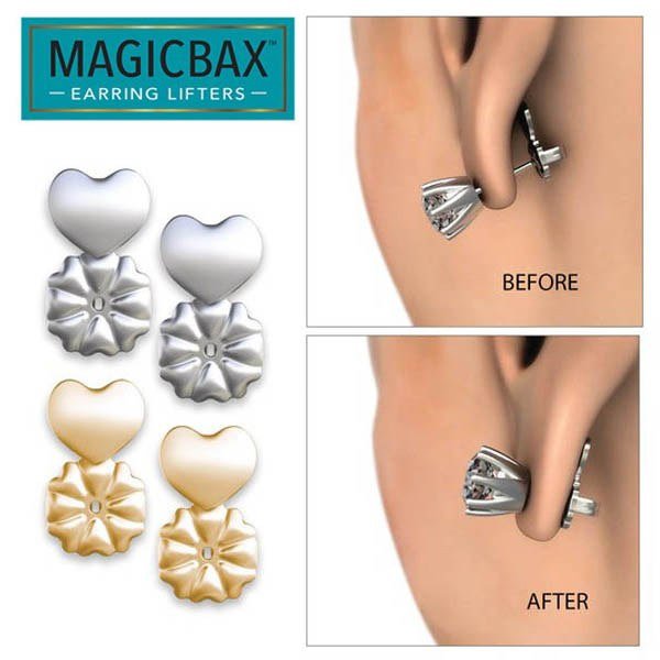 Jsou ideální, pokud máte protáhlé ušní lalůčky nebo nosíte těžké náušnice – Magic Bax puzetky náušnici přizvednou a udrží ve vzpřímené poloze po celý den. Jejich použití je pohodlné a bezpečné, jsou potaženy stříbrem a 14K zlatem a jsou hypoalergenní.