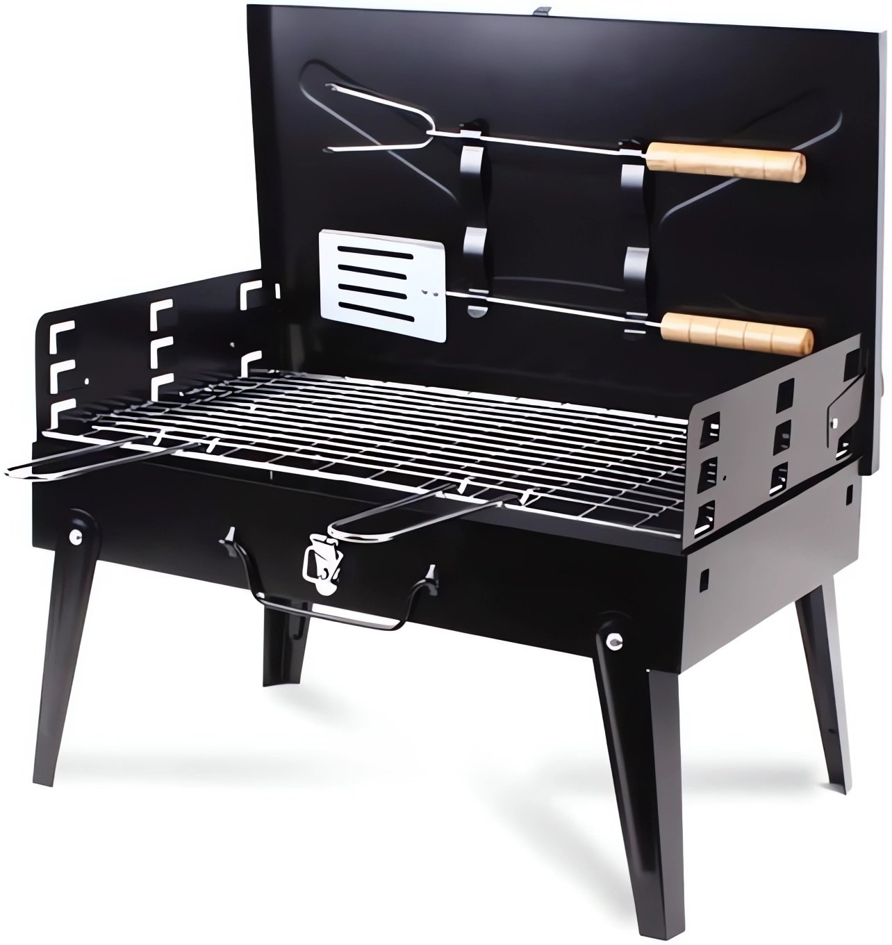 Přenosný skládací gril na dřevěné uhlí, který je díky malým rozměrům skladný a praktický. Dá se také složit do tvaru kufříku, díky čemuž se velmi snadno přepravuje.