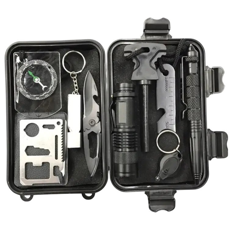 Sada pro přežití v praktické krabici, uvnitř je mnoho nářadí/předmětů užitečných v přírodě.