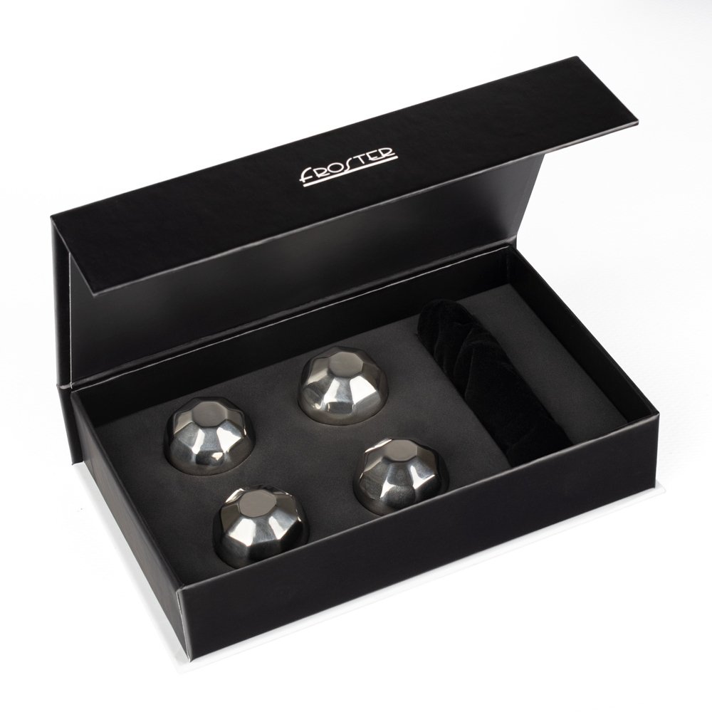 V sestavě jsou 4 kostky ve tvaru diamantu a černá taštička na jejich uschování. Ledové kostky zchladí Vaše oblíbené nápoje bez ředění a změny chutě.