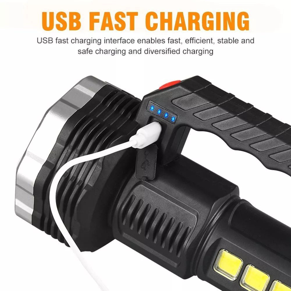 Velmi výkonná přenosná nabíjecí svítilna vybavená 13 LED na přední straně a 1 COB LED na boku zařízení.