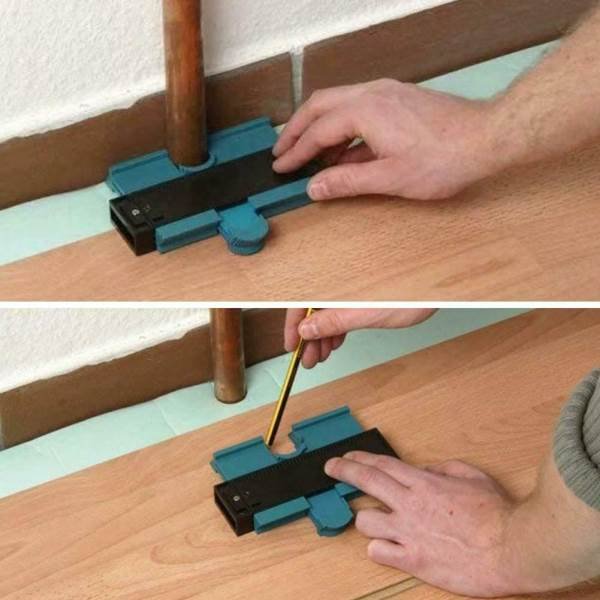 Šablonu uchopte za černou nepohyblivou část a vyrovnejte všechny pohyblivé části na jednu stranu. Položte šablonu na materiál, který potřebujete odříznout, a označte si její pozici. Přiložte šablonu kmístě překážky a na šablonu zatlačte. Ujistěte se, že tvar překážky je dobře vytlačen a přeneste ho na materiál určený k odříznutí.