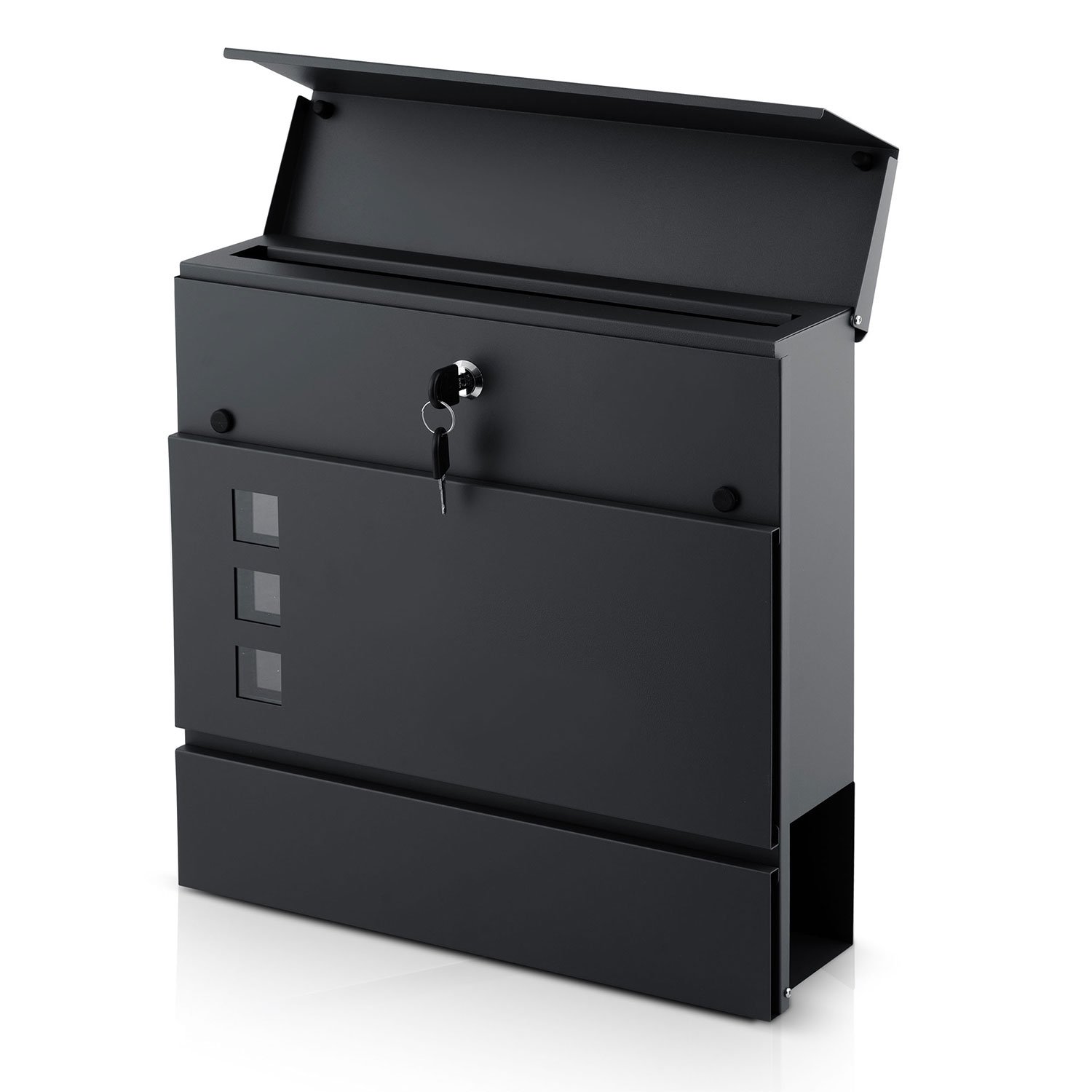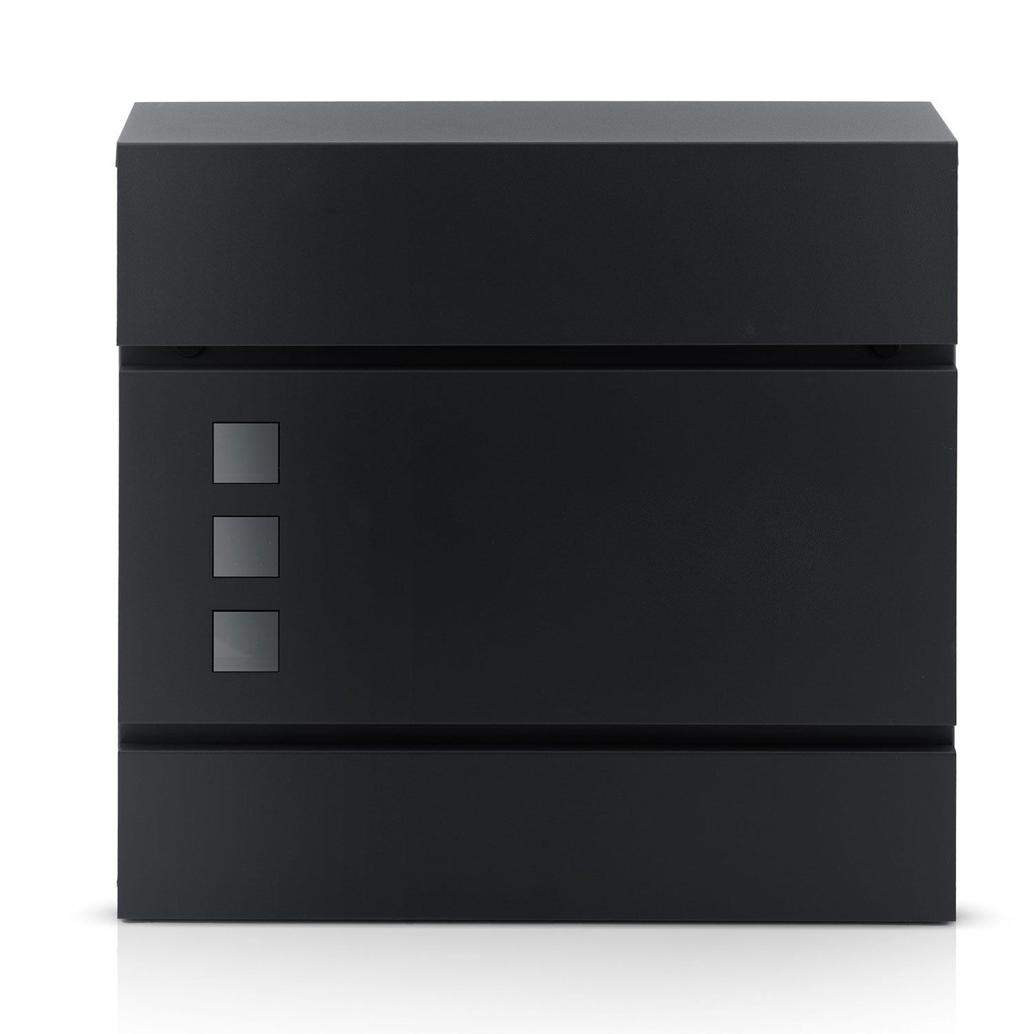 Moderní antracitová poštovní schránka z galvanizované oceli s gazetníkem, tichým vhozem a okénkem.