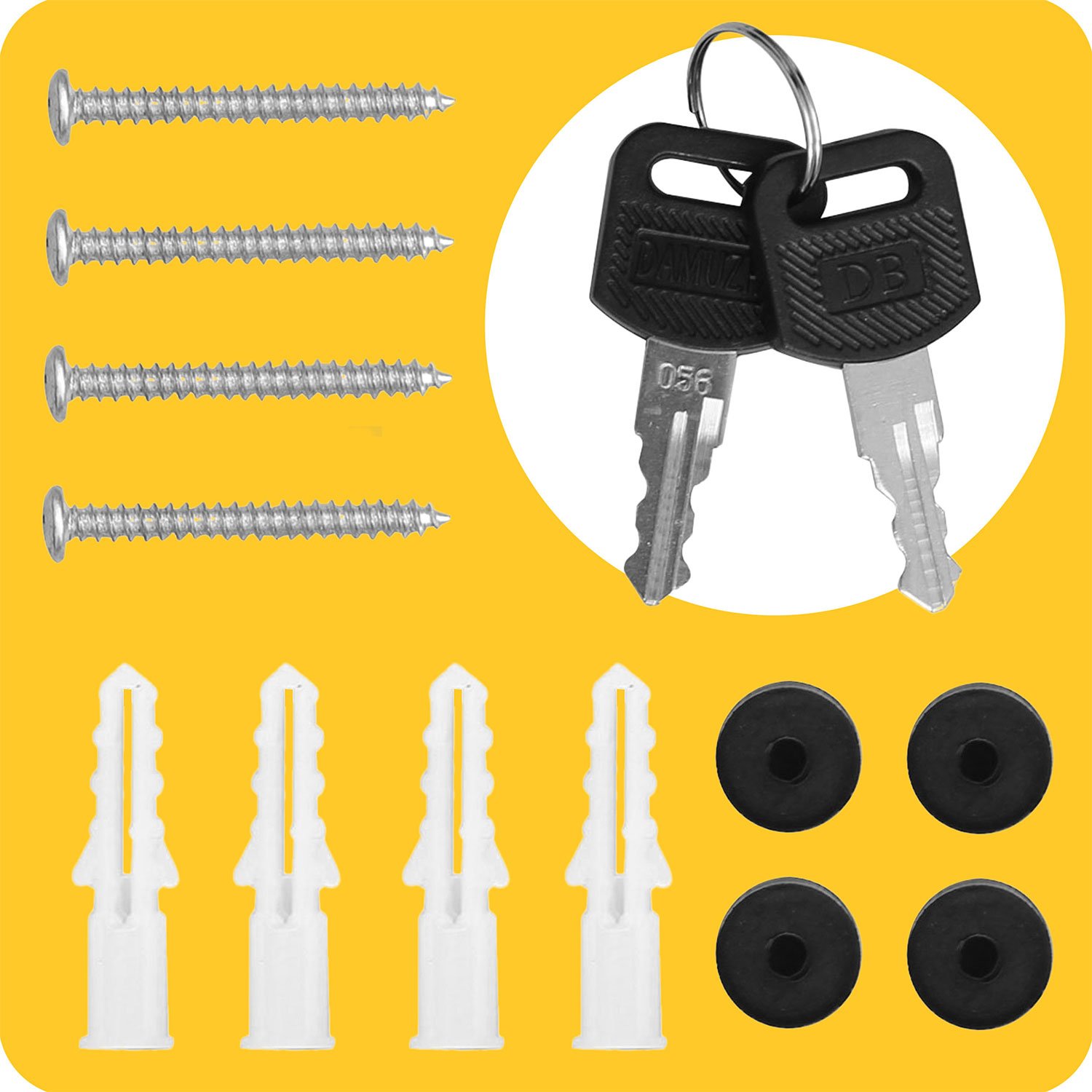 Při montáži použijte vhodné hmoždinky a šrouby a ověřte nosnost podkladu. Upozornění na malé díly a ostré hrany – montujte mimo dosah dětí. Klíče uchovávejte na bezpečném místě. Nezatěžujte dvířka a nepoužívejte agresivní čisticí prostředky.