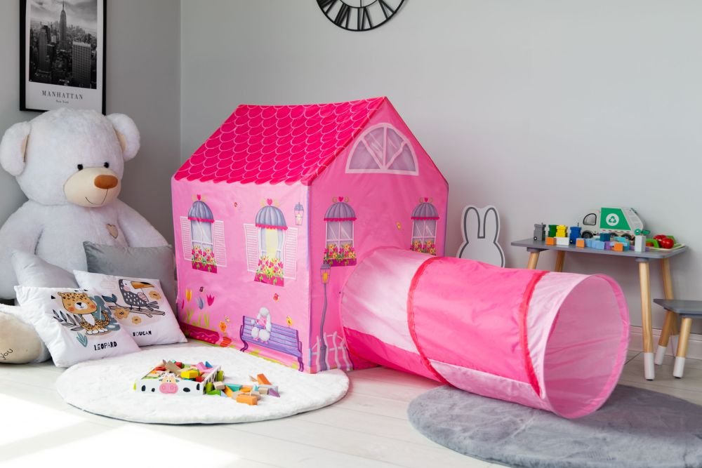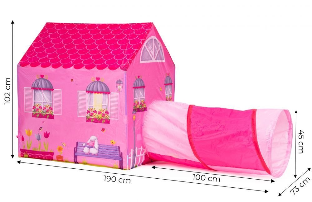 Dětský hrací stan ve tvaru domečku s připojeným prolézacím tunelem je ideálním místem pro hru, odpočinek i rozvoj dětské fantazie.