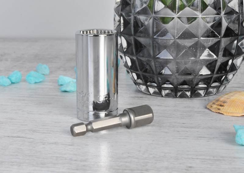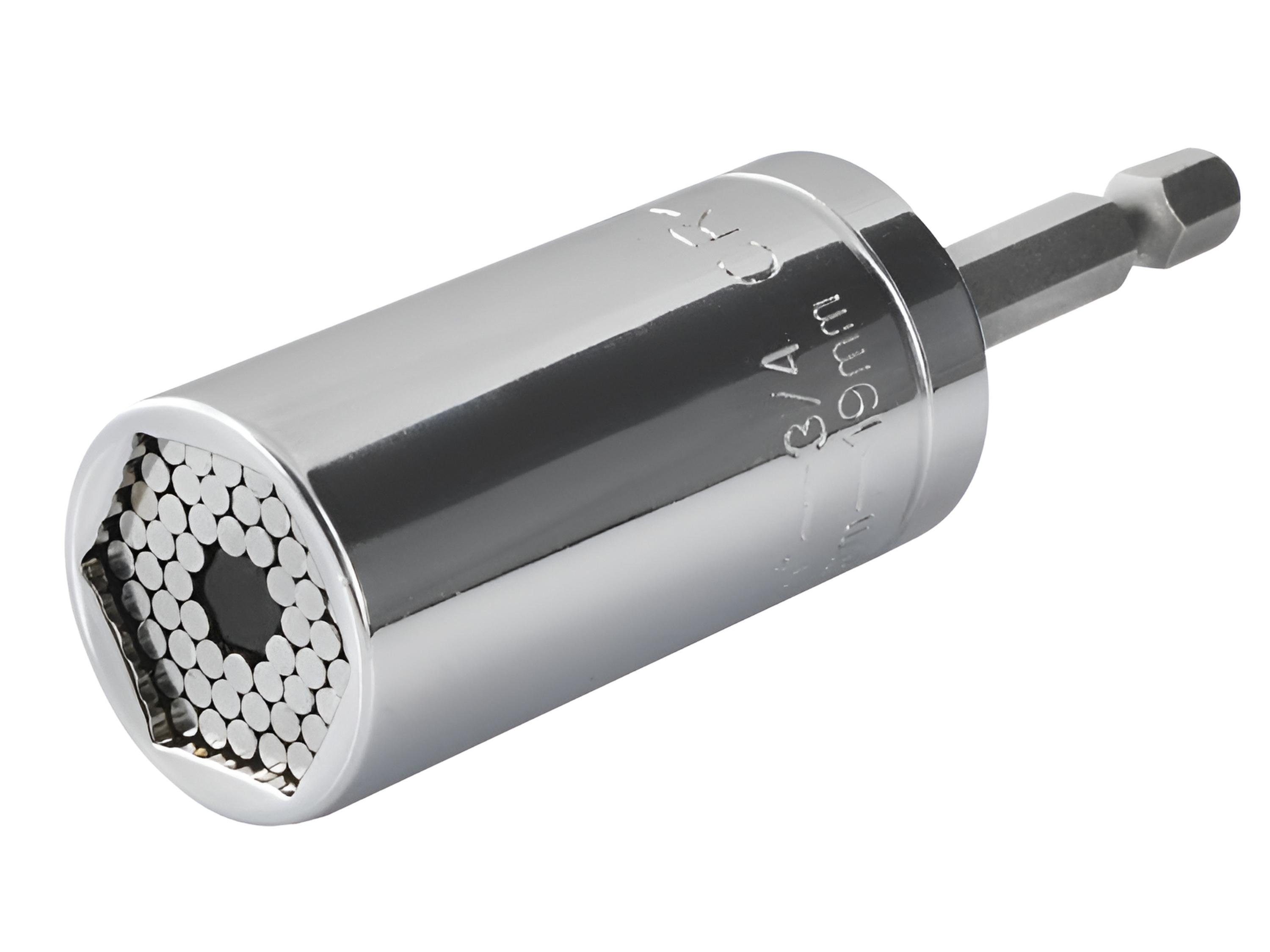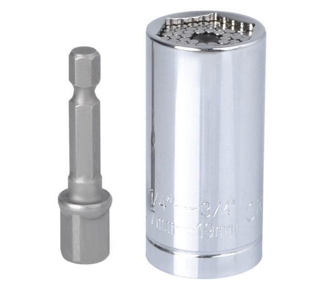 Kvalitní univerzální nástavcový klíč pro šrouby a matice v rozměrech od 7mm do 19 mm, libovolného tvaru (šestihranné, čtvercové), prošroubovací háčky, skoby a cokoliv dalšího v daném rozměru. Univerzální nástrčková hlava (ořech) je vyrobena z odolné chrom-vanadiové oceli (CR-V). Délka hlavy činí 53mm (bez bitového adaptéru).