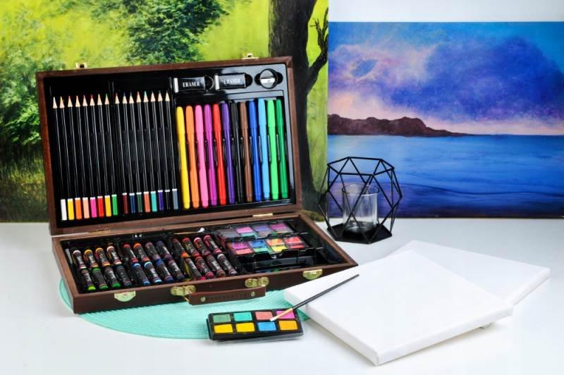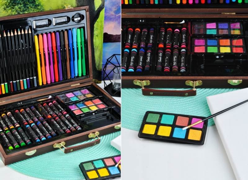Kompletní velká sada v dřevěném kufříku obsahuje 81 ks potřeb pro malé malíře. Jedná se hezký dárek na malování pro dítě k narozeninám, k svátku nebo k Vánocům, ať už pro holčiku nebo chlapečka, jenž si rád kreslí a maluje.