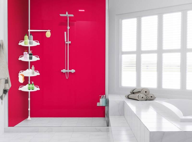 Rohová polička do sprchy na samo-rozporné tyči z nerezové oceli. Bez použití šroubu pohodlně upevníte teleskopickou tyč do nevyužitého koutu Vaši sprchy.