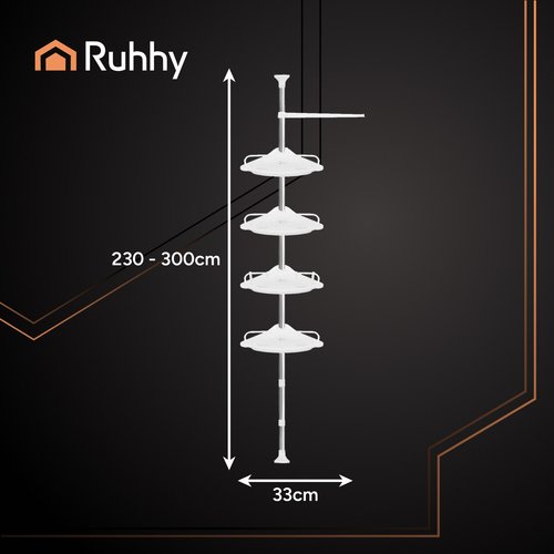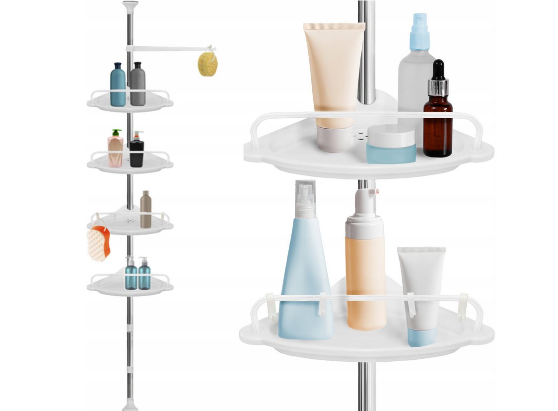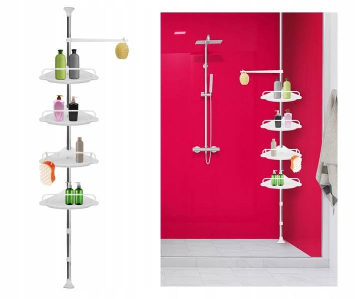Rohová polička do sprchy na samo-rozporné tyči z nerezové oceli. Bez použití šroubu pohodlně upevníte teleskopickou tyč do nevyužitého koutu Vaši sprchy. 4 rohové odkládací misky, které jsou volně polohovatelné, poskytují dostačující odkládací plochu k odložení všech toaletních potřeb tak, že jsou vždy v dosahu Vaši ruky.