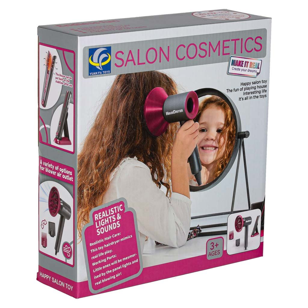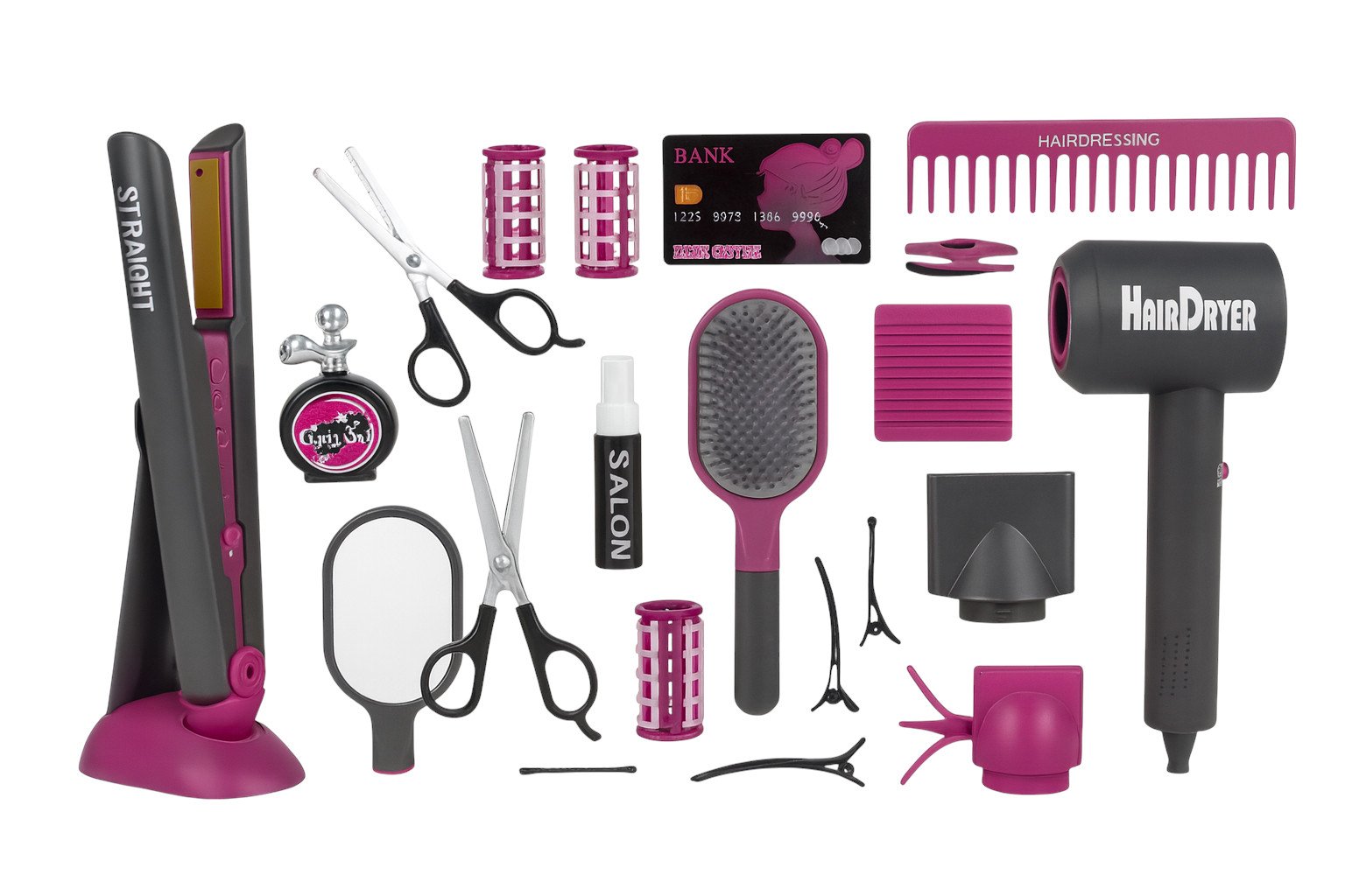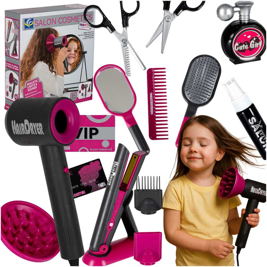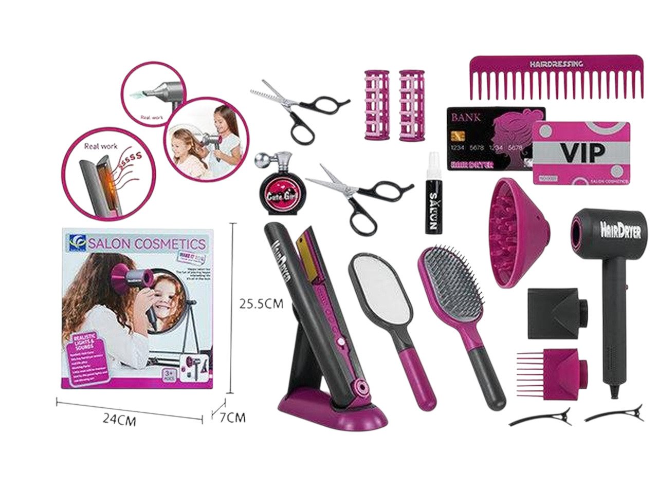 Dětská sada Salon Cosmetics – kadeřnický set 20 dílů je ideální hračka pro malé milovnice krásy a módy! Díky bohatému příslušenství si děti mohou vytvořit vlastní kadeřnický salon přímo doma. Sada obsahuje vše potřebné – fén, žehličku na vlasy, kartáče, nůžky, natáčky, hřebeny, sponky a další doplňky.
