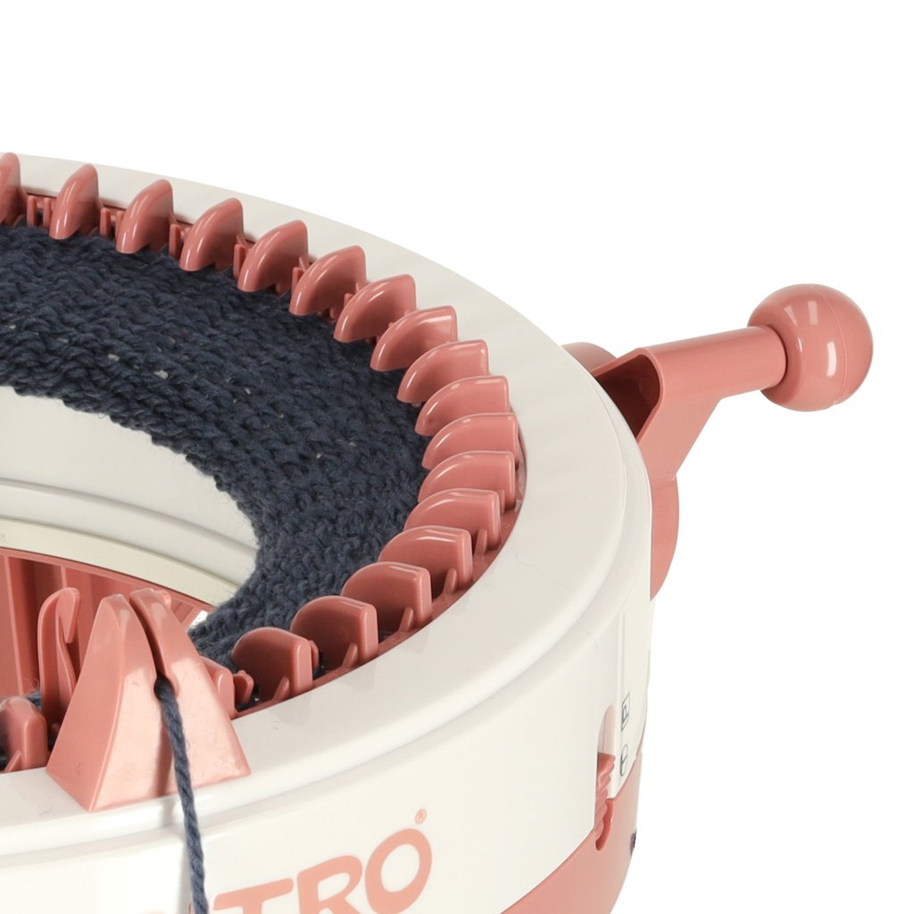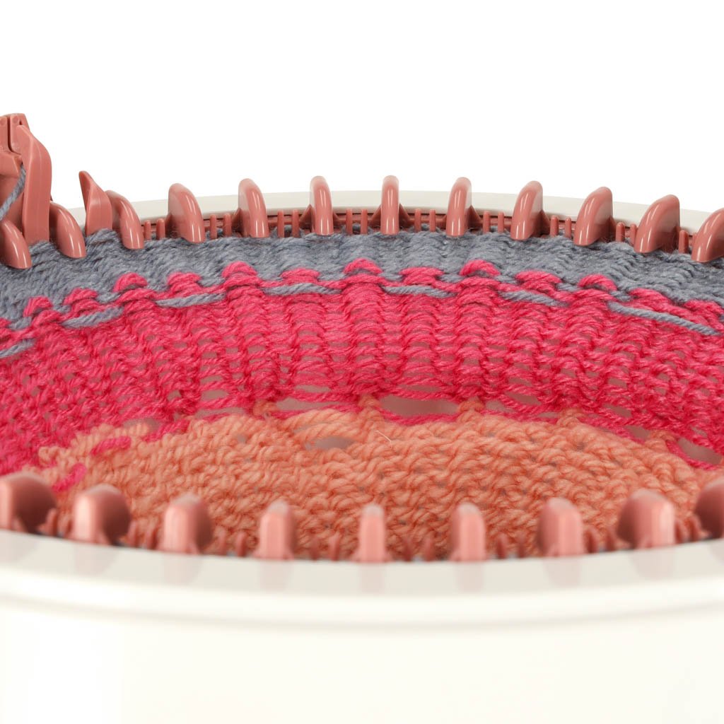 Pletací stroj je hračka, která dětem umožňuje vyrobit si vlastní šálu nebo čepici. Nepotřebuje baterie - jehly se posouvají ručně pomocí knoflíku. Stroj je vybaven 22 jehlami, které umožňují vytvářet ploché a kruhové stehy. Sada obsahuje dvě příze šedou a růžovou, jehlu a háček. Hračka podporuje rozvoj kreativity a zlepšuje manuální dovednosti dětí.
