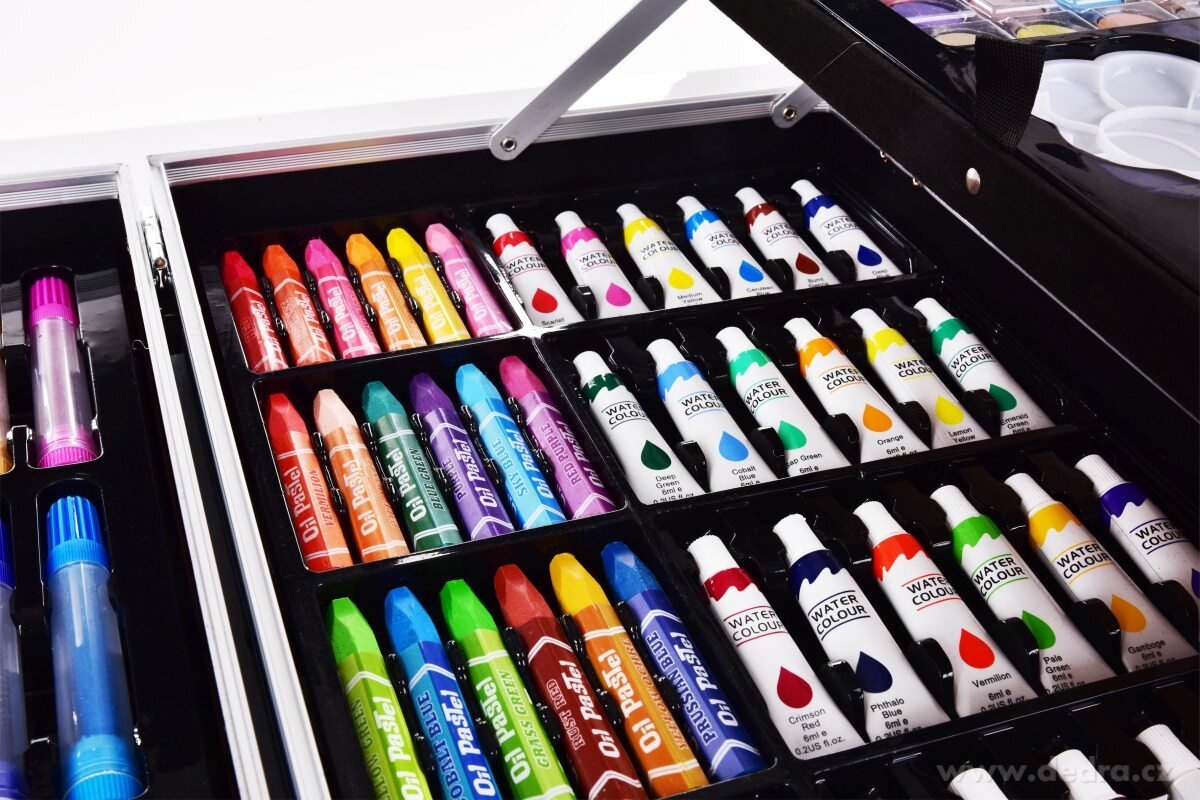 Sada 145 prvků obsahuje mimo jiné: tužky, fixy, pastely, barvy, štětce, gumy, ořezávátka a mnoho dalšího.