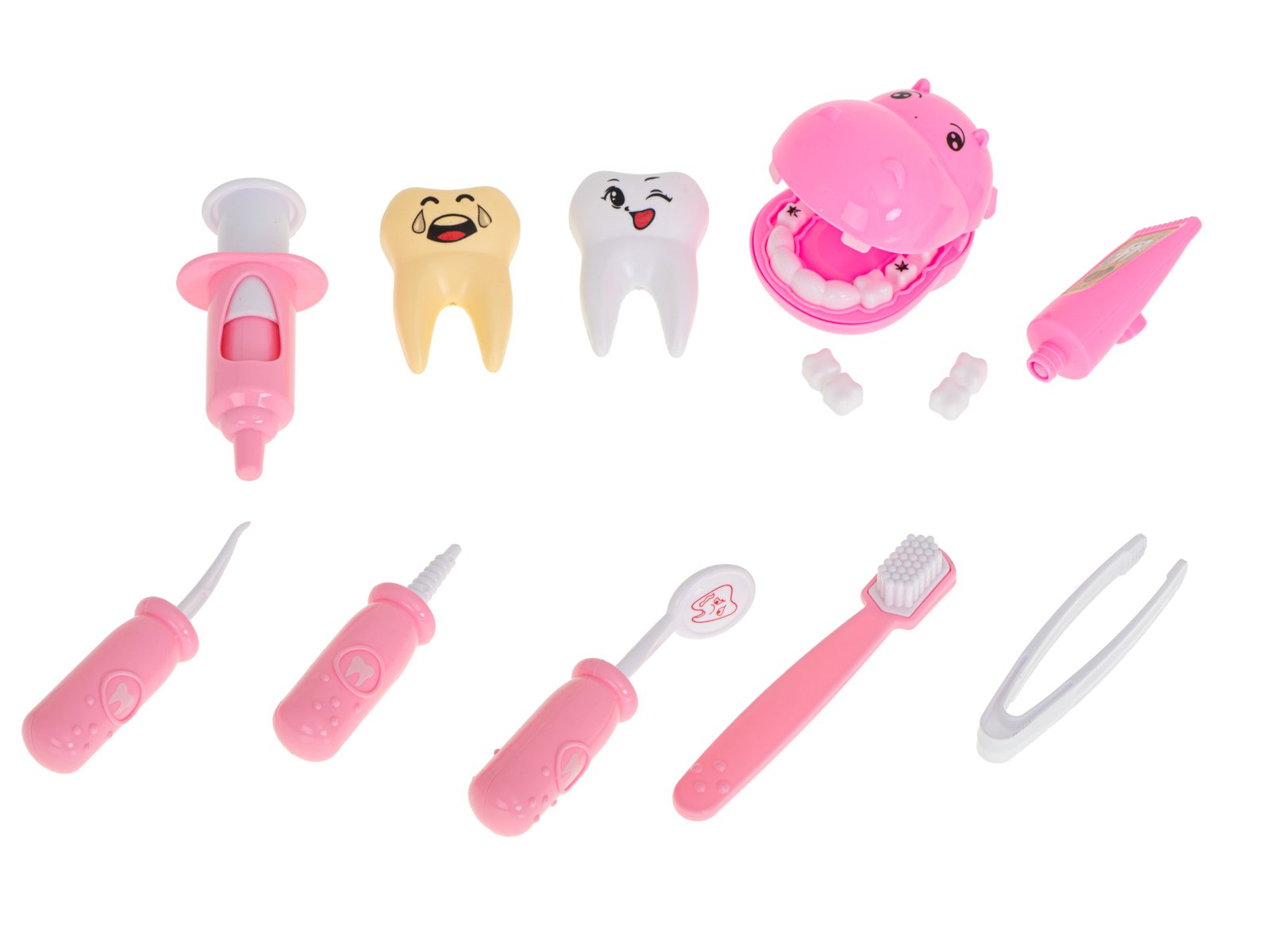Sada s vybavením zubní ordinace. Obsahuje otevírací zuby, injekci, kartáček, pinzetu, vrtačku, zrcátko a další doplňky.