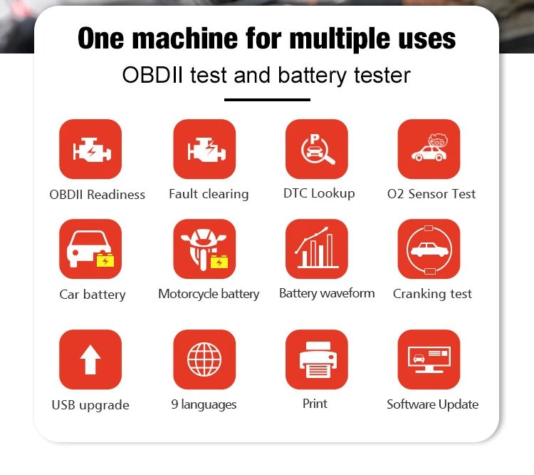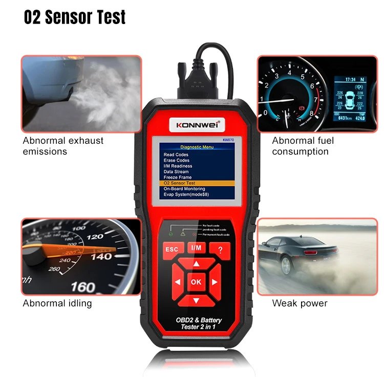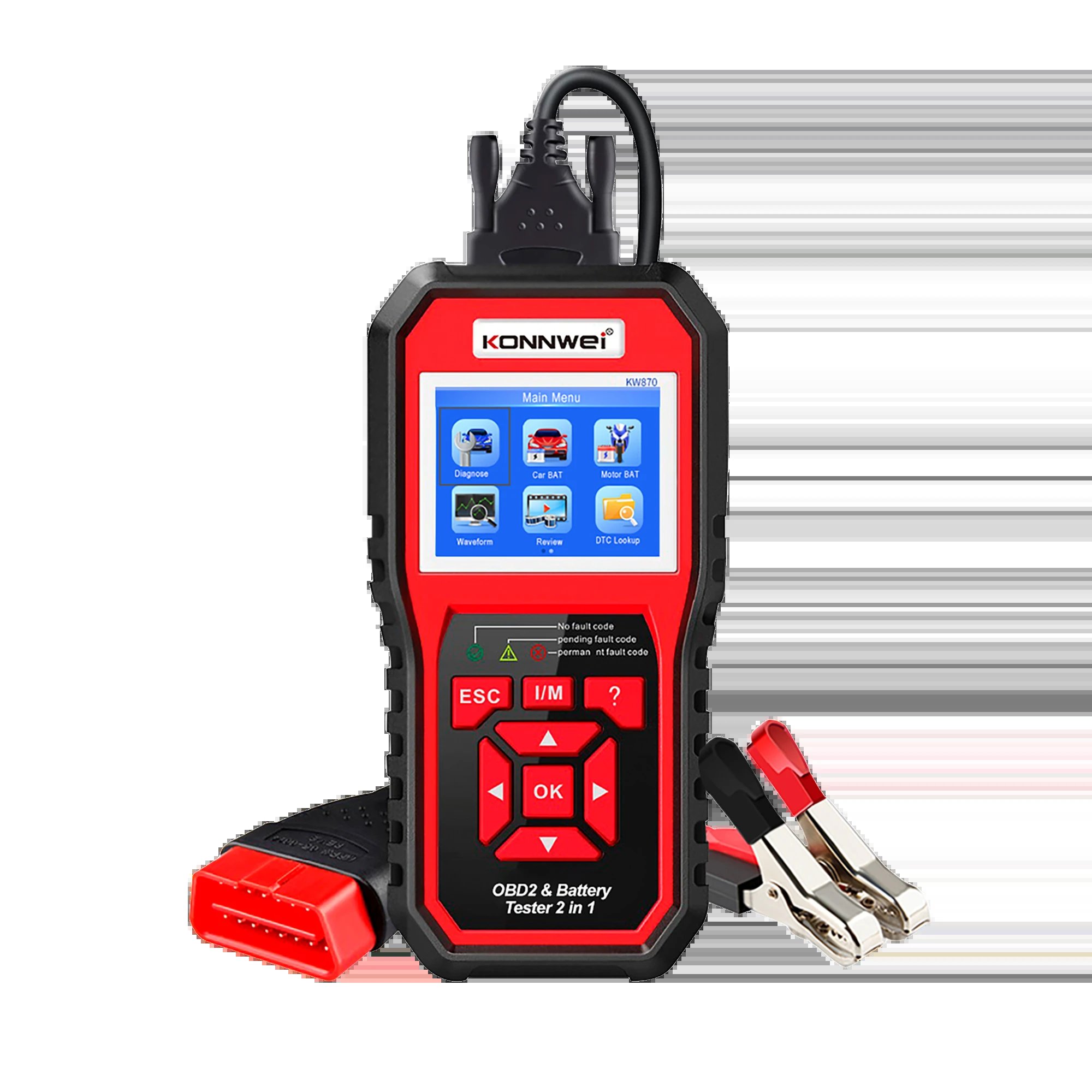 Konnwei KW870 je praktický kombinovaný nástroj pro diagnostiku vozidel a kontrolu akumulátorů. Jako OBD2 tester je určen pro zážehové i vznětové motory a umožňuje čtení i mazání chybových kódů řídicí jednotky. Kromě toho nabízí průběžné sledování aktuálních parametrů vozidla a testování čidel, což usnadňuje rychlé odhalení příčin závad a jejich následné odstranění.