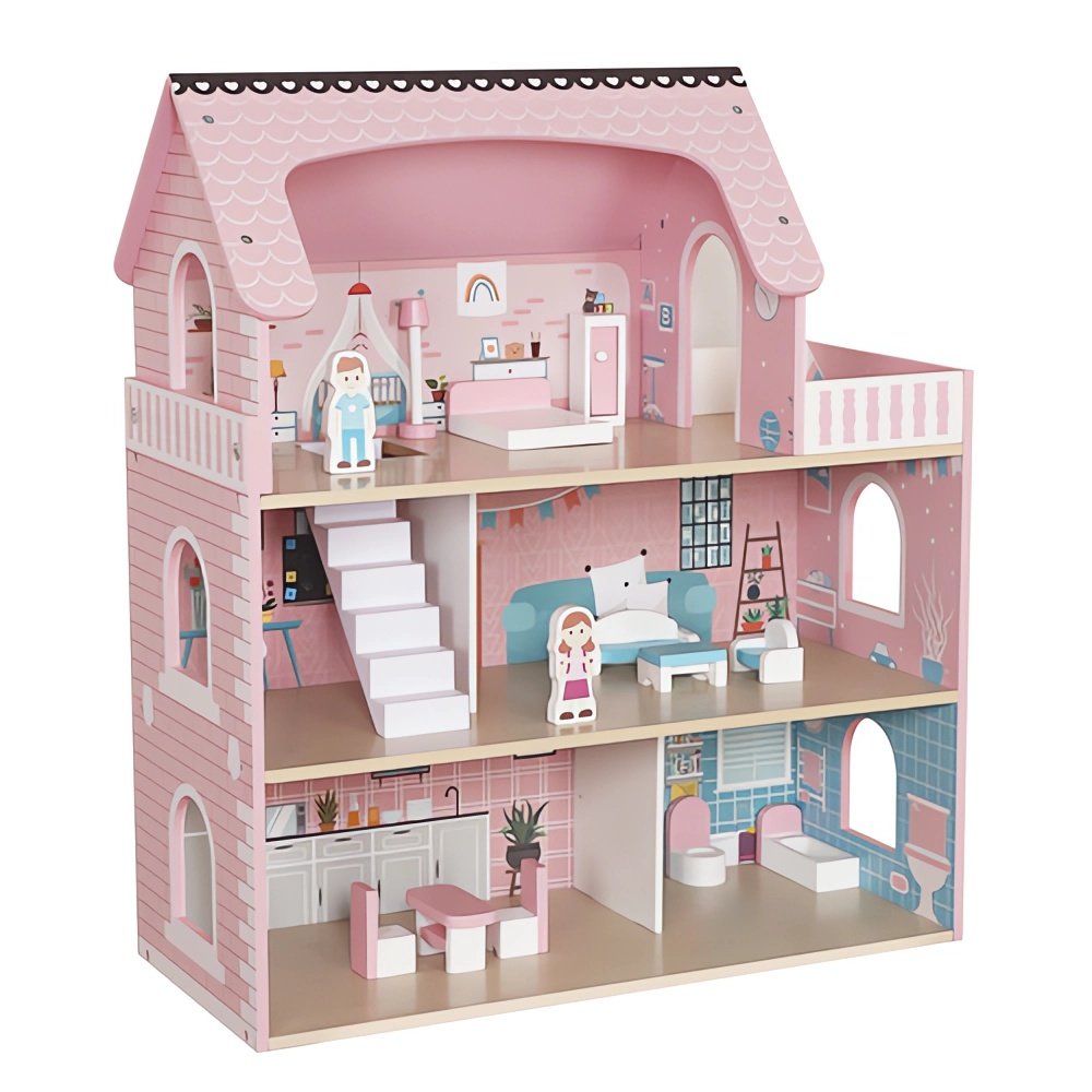 Kouzelný třípatrový dřevěný domeček pro panenky přináší nekonečné hodiny zábavy a tvořivého hraní. Tento krásně navržený růžový domeček je vybaven nábytkem a figurkami a nabízí realistické detaily, které podněcují dětskou představivost. Je vhodný pro děti od 3 let a díky kvalitnímu dřevěnému provedení zaručuje dlouhou životnost i bezpečné hraní.