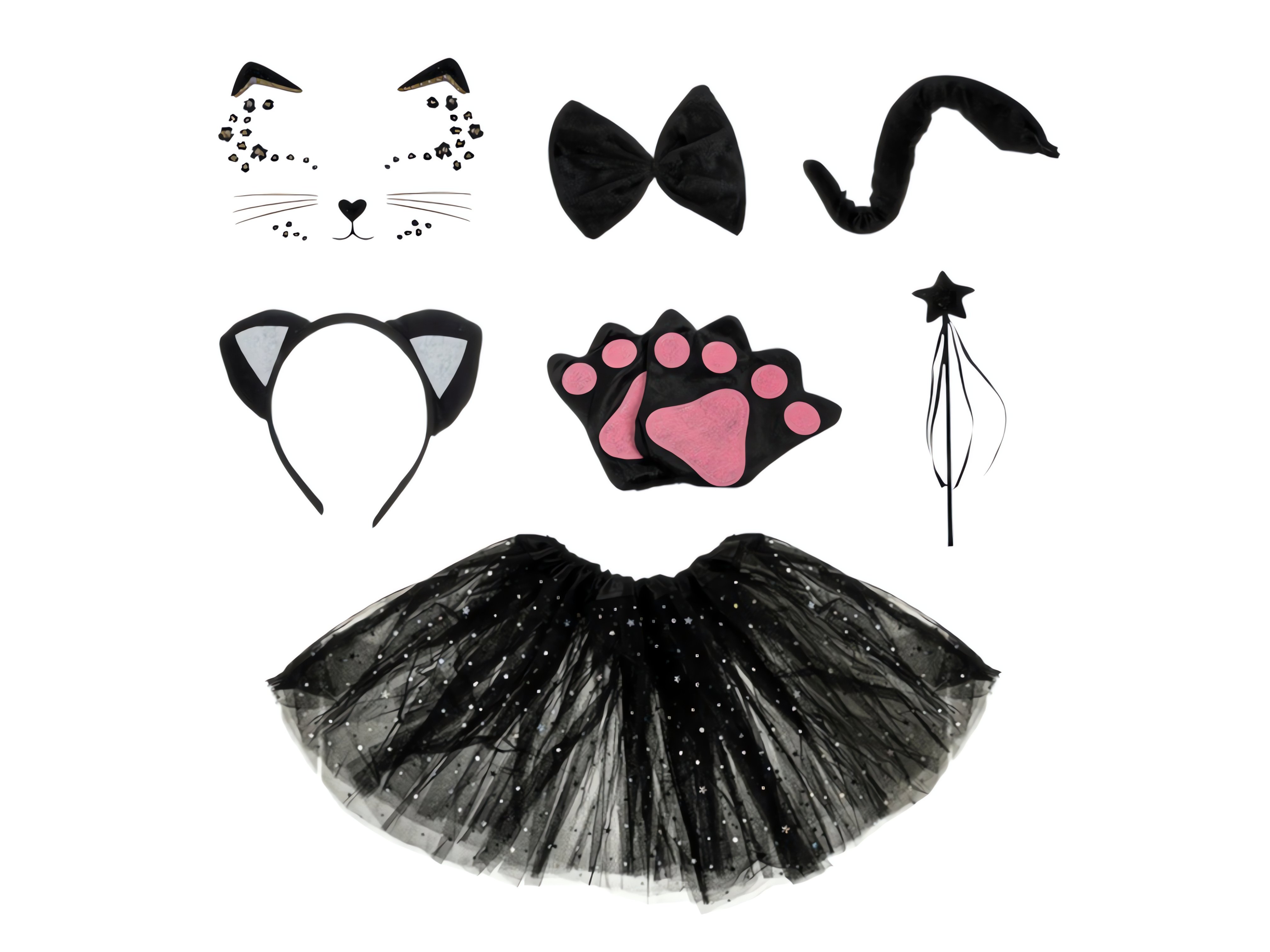 Souprava obsahuje vše potřebné pro dokonalou proměnu v kočičku – nadýchanou tylovou sukýnku, čelenku s oušky, mašli, tlapky, ocásek, kouzelnou hůlku a ozdobné samolepky na obličej.