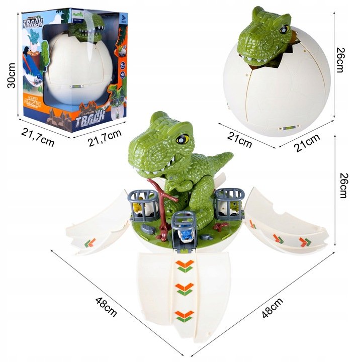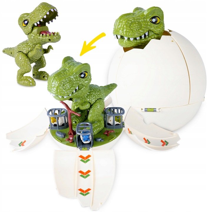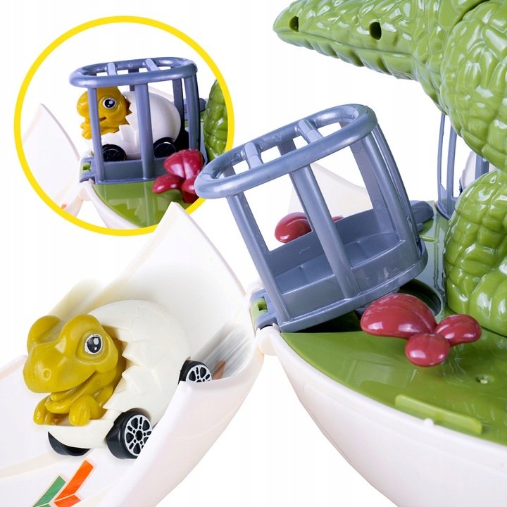 Po otevření vajíčka se promění v hřiště se sjezdovými dráhami, klecemi a vystřelovací rampou. Děti si mohou přehrávat scénky ze života dinosaurů, závodit s vozidly a rozvíjet fantazii i motoriku.
