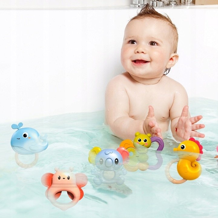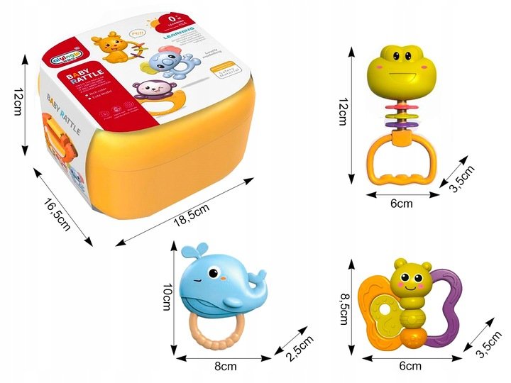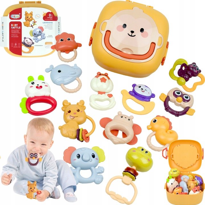 Rozkošná sada chrastítek a kousátek pro miminka je ideální volbou pro první hračky vašeho děťátka. Barevná zvířátka v podobě velryby, žirafy, sovy, motýlka či mořského koníka rozvíjejí smysly dítěte, podporují koordinaci ruka–oko a stimulují sluch. Chrastítka jsou lehká, snadno uchopitelná a vyrobena z bezpečných, netoxických materiálů. Vše je uloženo v praktickém kufříku s ouškem, který usnadňuje přenášení i skladování hraček.