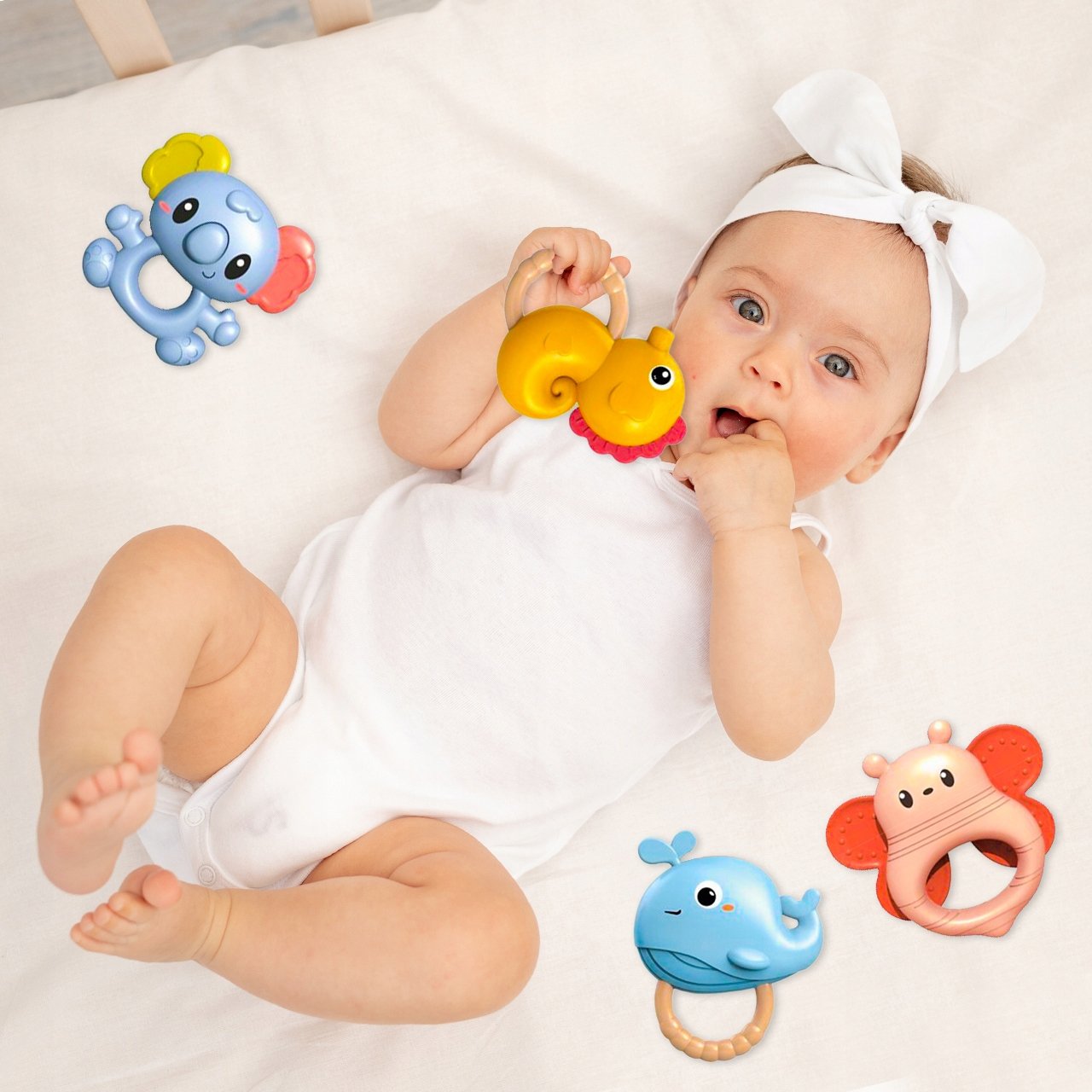 Rozkošná sada chrastítek a kousátek pro miminka je ideální volbou pro první hračky vašeho děťátka.
