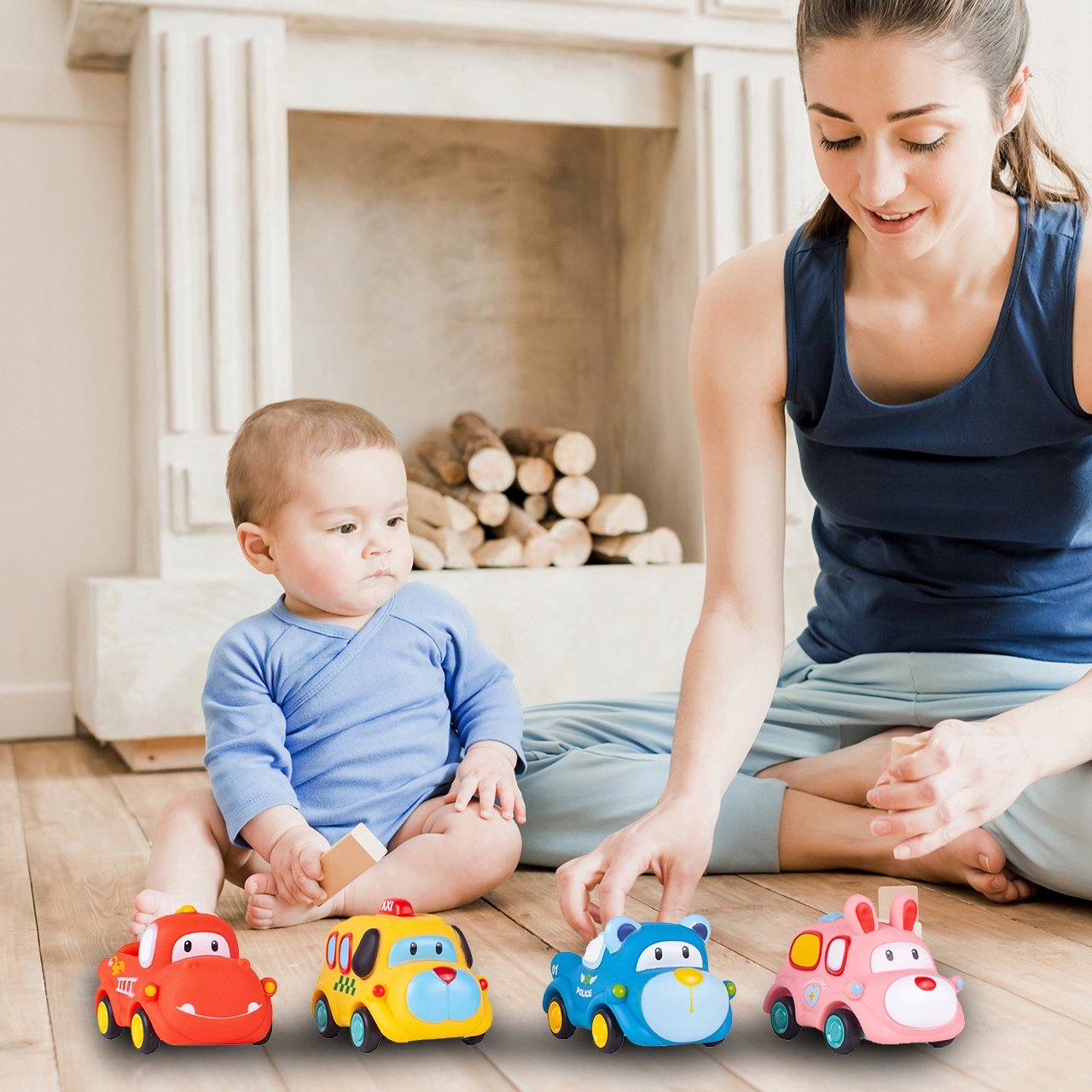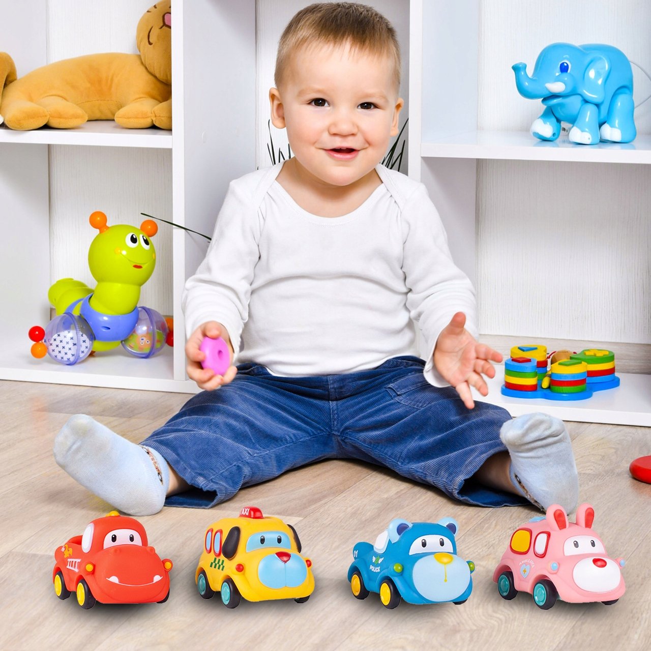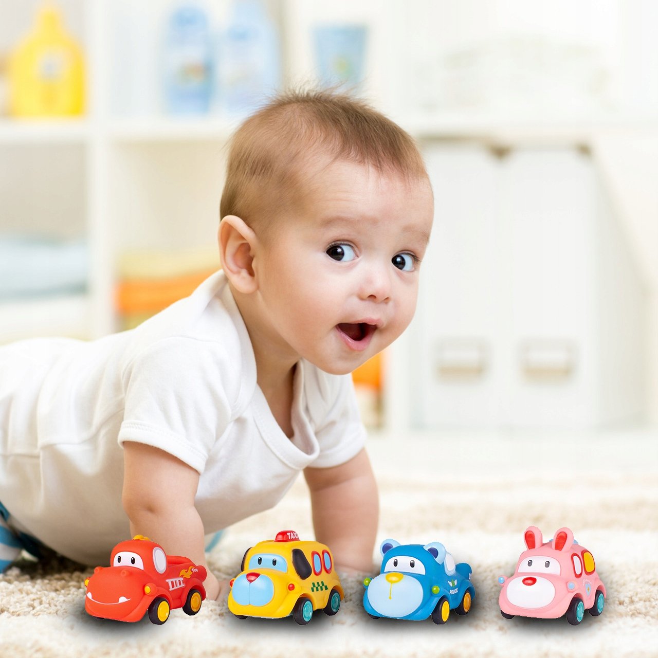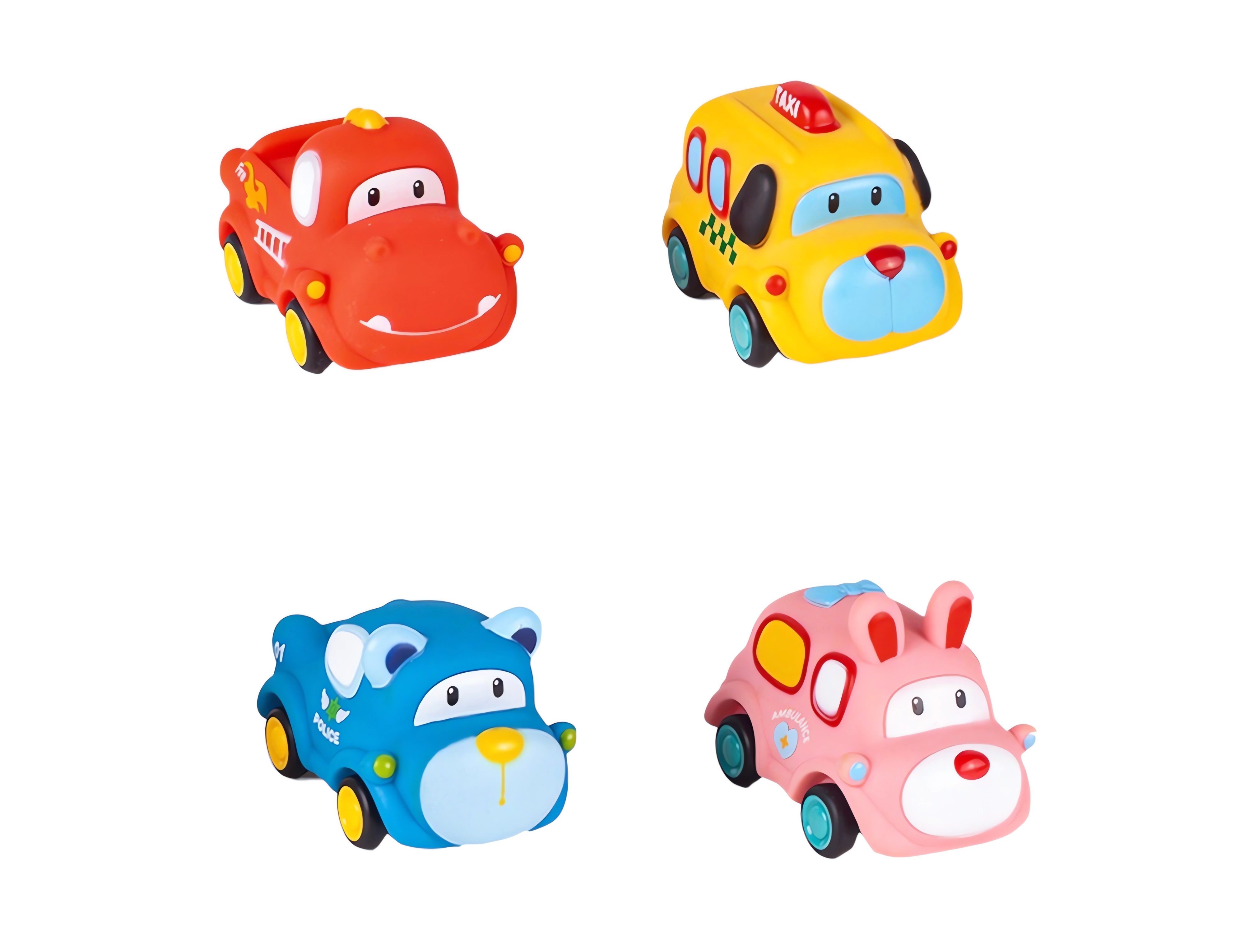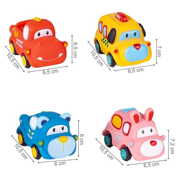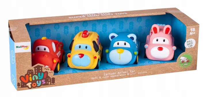 Každé vozidlo má zvířecí motiv (pes, medvídek, králíček, lev) a je vybaveno pohonem na zpětné natažení – stačí ho natáhnout dozadu a pustit, aby samo vyrazilo vpřed!