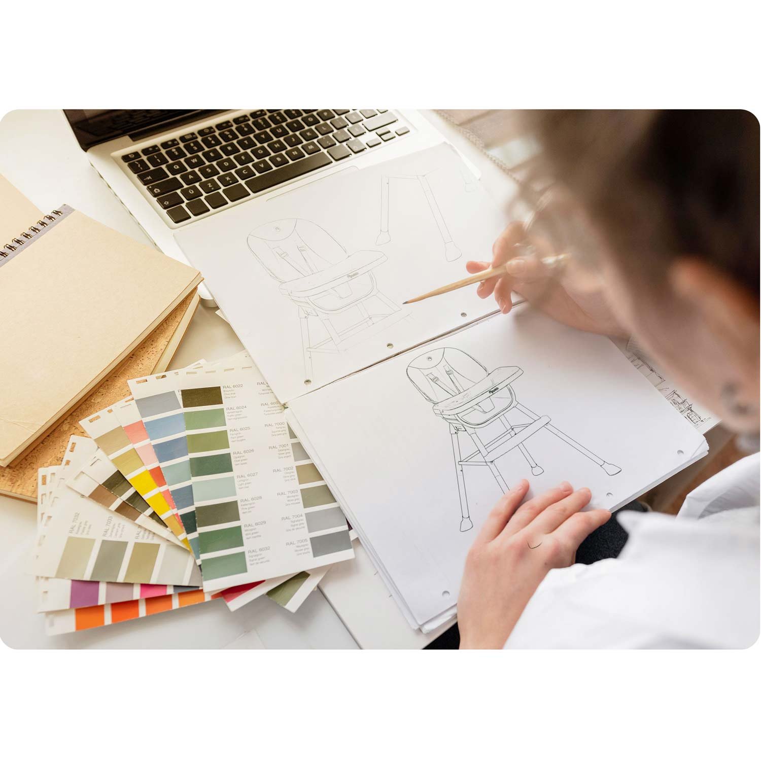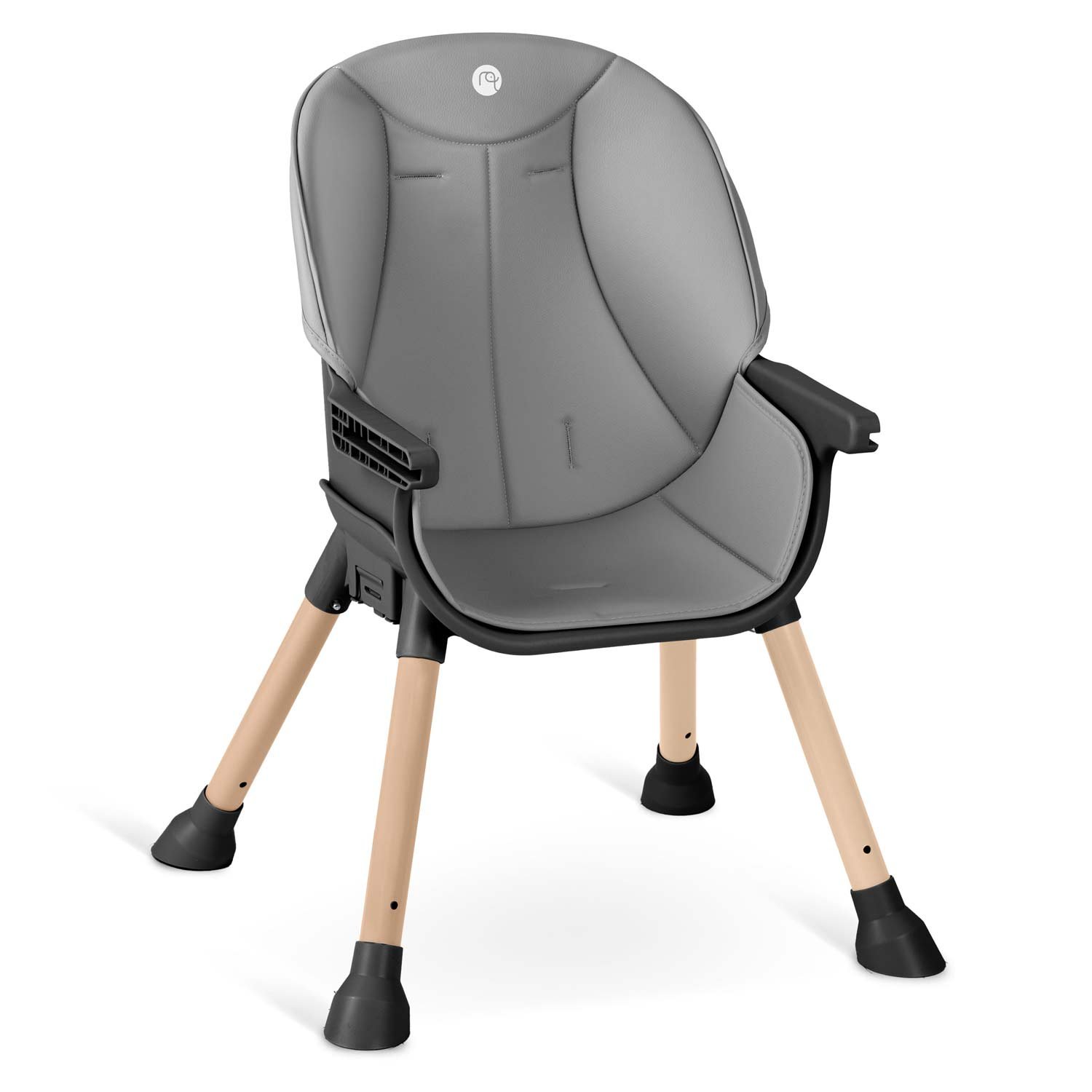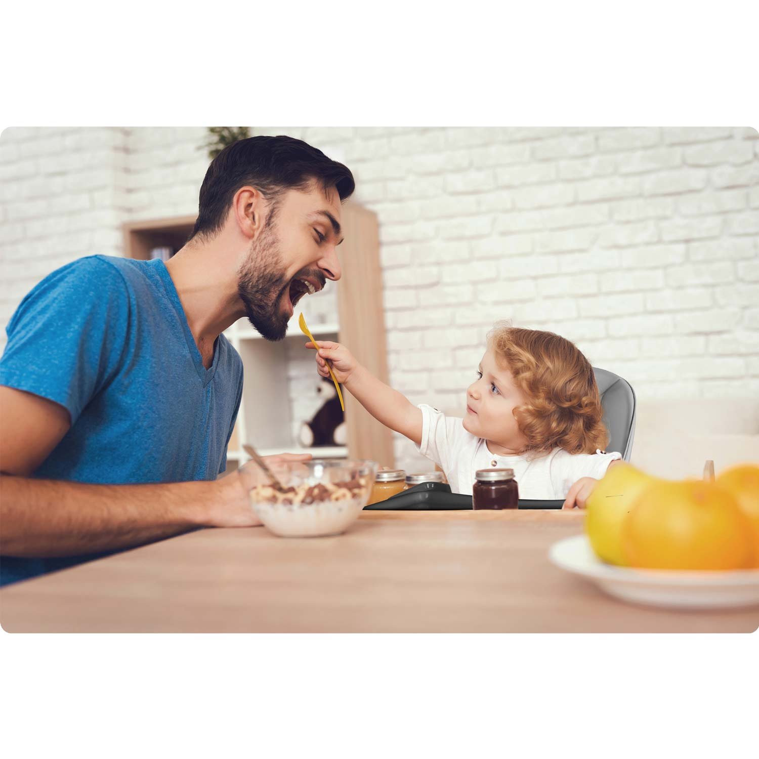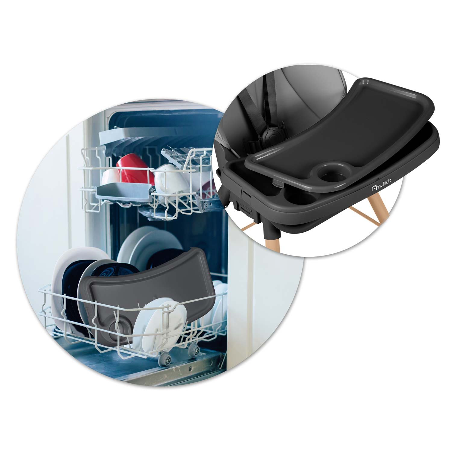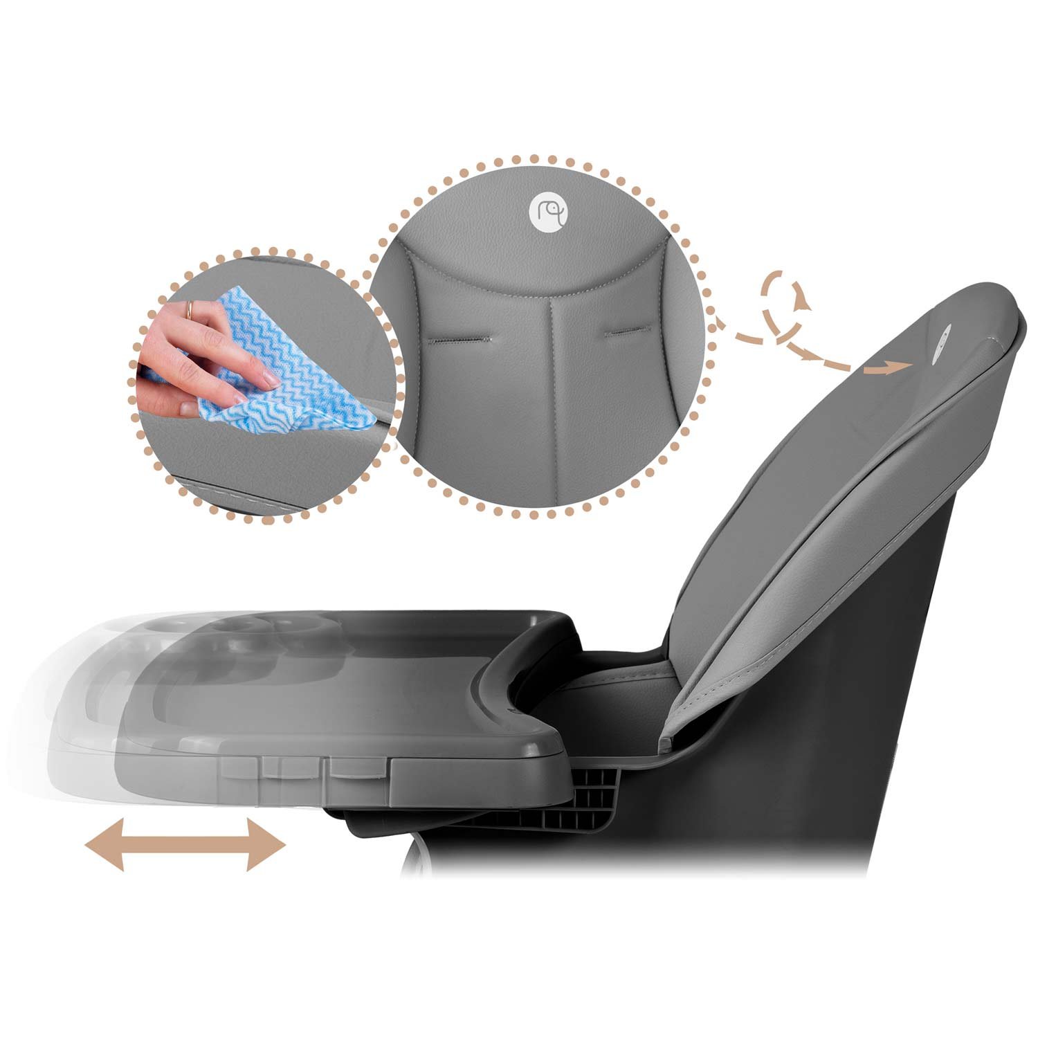 Židlička nabízí regulovatelnou polohu tacky, kterou lze přiblížit či oddálit jednoduchým pohybem plynule dopředu/dozadu. Tacku lze kdykoli úplně vyjmout a využít odnímatelnou nástavku se zvýšenými okraji, která pomáhá udržet nepořádek pod kontrolou. Potah je měkký a příjemný, zároveň z materiálu, který nevsakuje nečistoty – stačí jej setřít vlhkým hadříkem a je opět čistý. Samotnou tacku lze umýt pod tekoucí vodou nebo v myčce.
