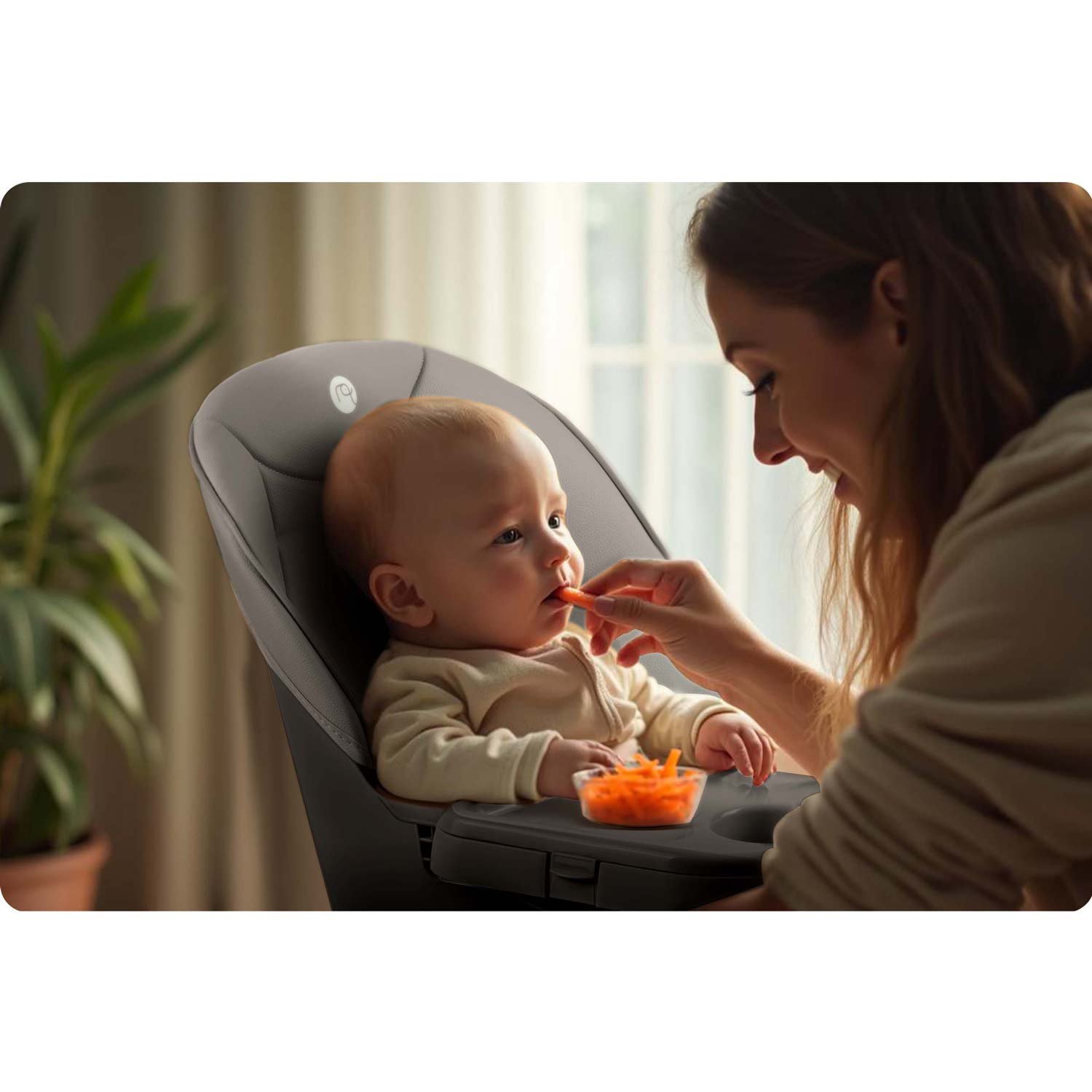 Stabilní jídelní židlička s nastavitelnou tackou, 5bodovými pásy a snadným čištěním. Od 6 měsíců.