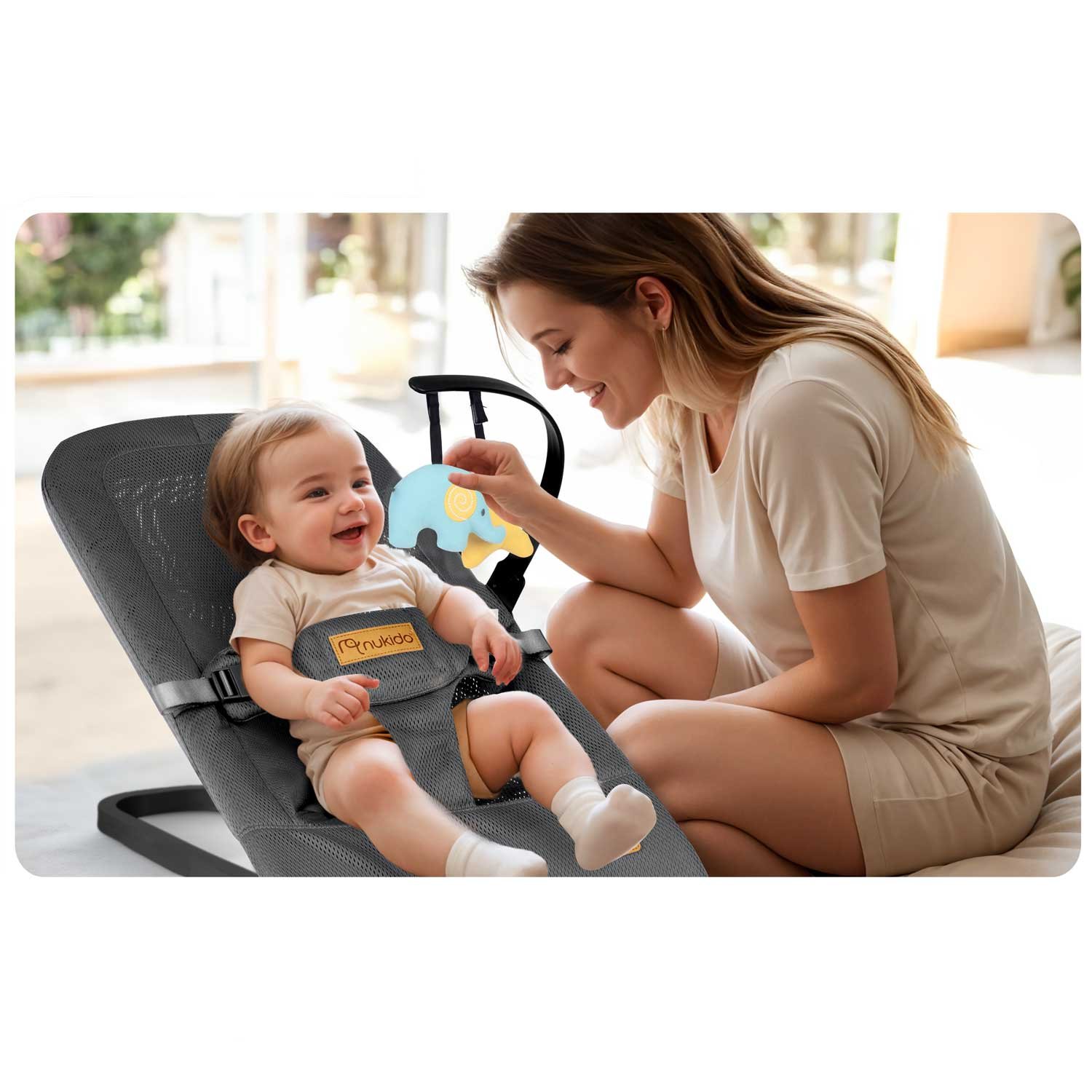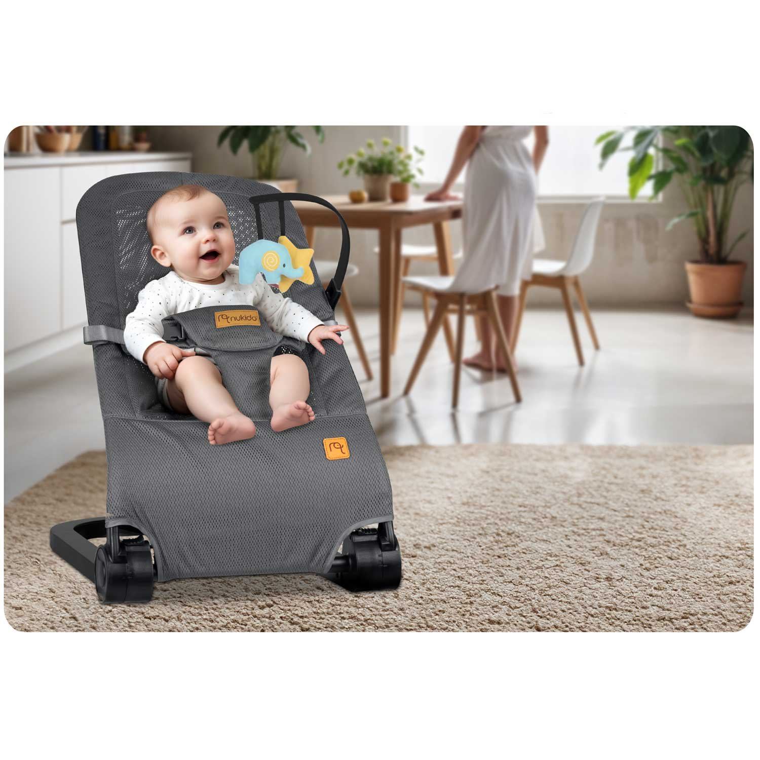 Nukido Baby Bouncer NK-52 je leháček-bujaček 2v1 s odnímatelným obloukem a měkkými hračkami, který podporuje aktivní hru a přirozený rozvoj miminka. Promyšlená konstrukce nepřestimulovává, ale motivuje k zapojení smyslů i pohybu. Provedení v šedé barvě, měkké sedátko a prodyšné, na dotek příjemné textilie zajišťují pohodlí i v teplejších dnech.
