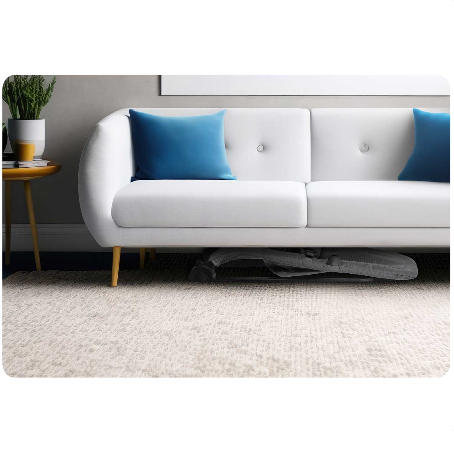 Důraz na bezpečí a praktičnost podtrhují 3bodové pásy, protiskluzové nožky a stabilní, lehká konstrukce. Sedací potah lze snadno sejmout a prát ručně pro hygienické používání. Lehátko složíte na plocho – to šetří místo doma i při převozu a usnadňuje přenášení. Díky kompaktním rozměrům základny je dítě vždy nablízku a snadno se zapojí do každodenního dění v domácnosti.