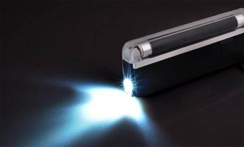 Praktická baterka s bílou svítivou diodou (LED) a zářivka svítící ultrafialově. Vhodná na zkoušení pravosti bankovek a dokumentů (které mají značky viditelné v UV záření).