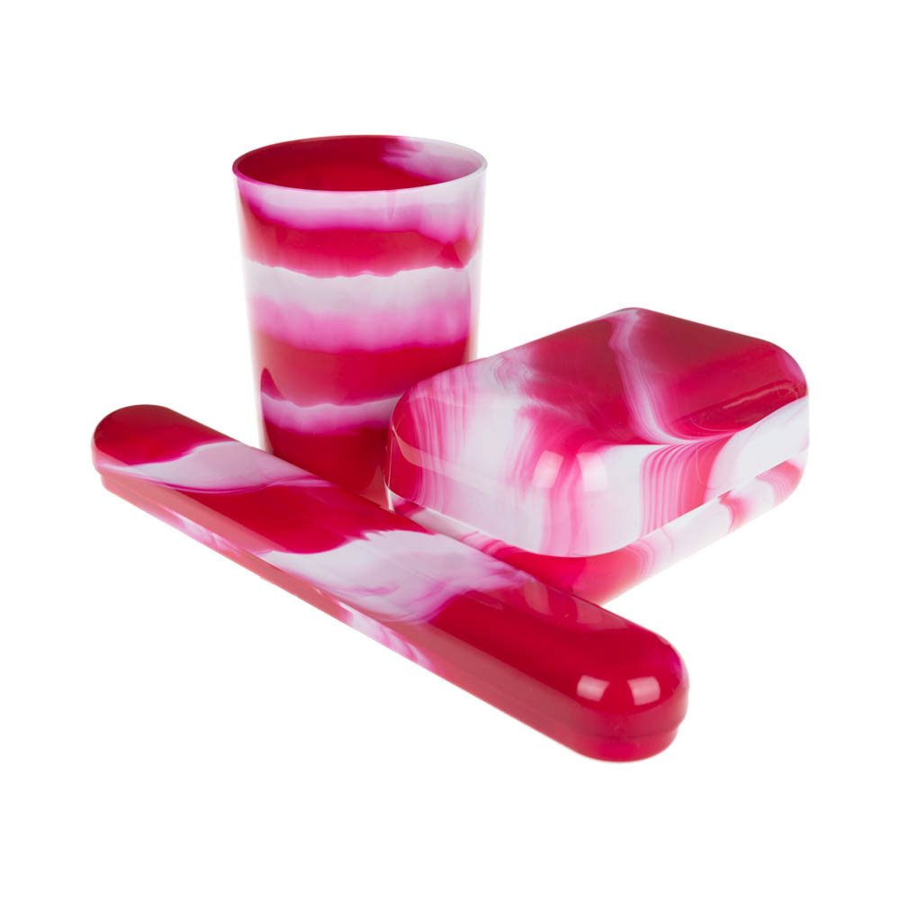 Praktická cestovní sada na hygienické potřeby sestávající z kelímku, pouzdra na mýdlo a pouzdra na kartáček je vhodná zejména na cestování a dětské tábory.