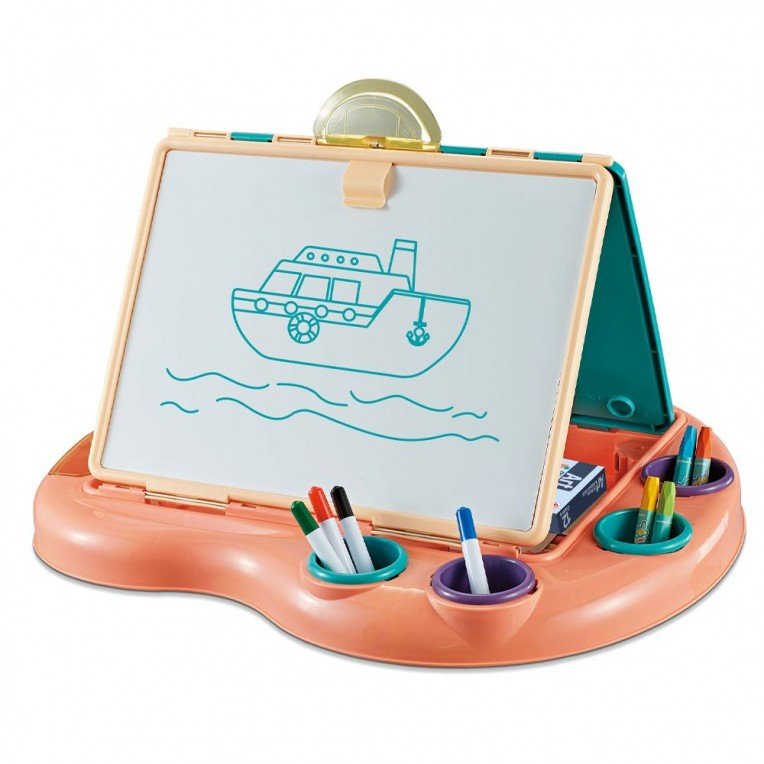 Praktický stolek s místy pro uložení kreslicích / malířských nástrojů zabírá ve složeném stavu málo místa.