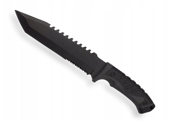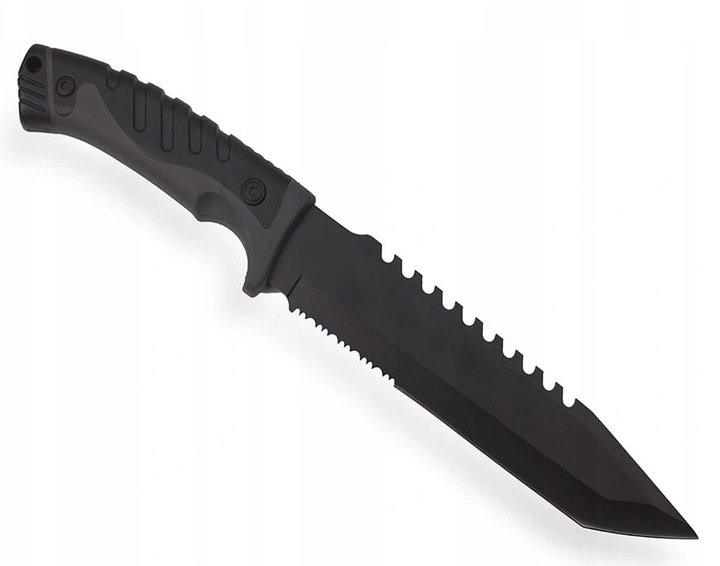 Taktický nůž s pevnou čepelí vyrobený z odolné oxidované oceli, která mu dodává vojenský charakter.
