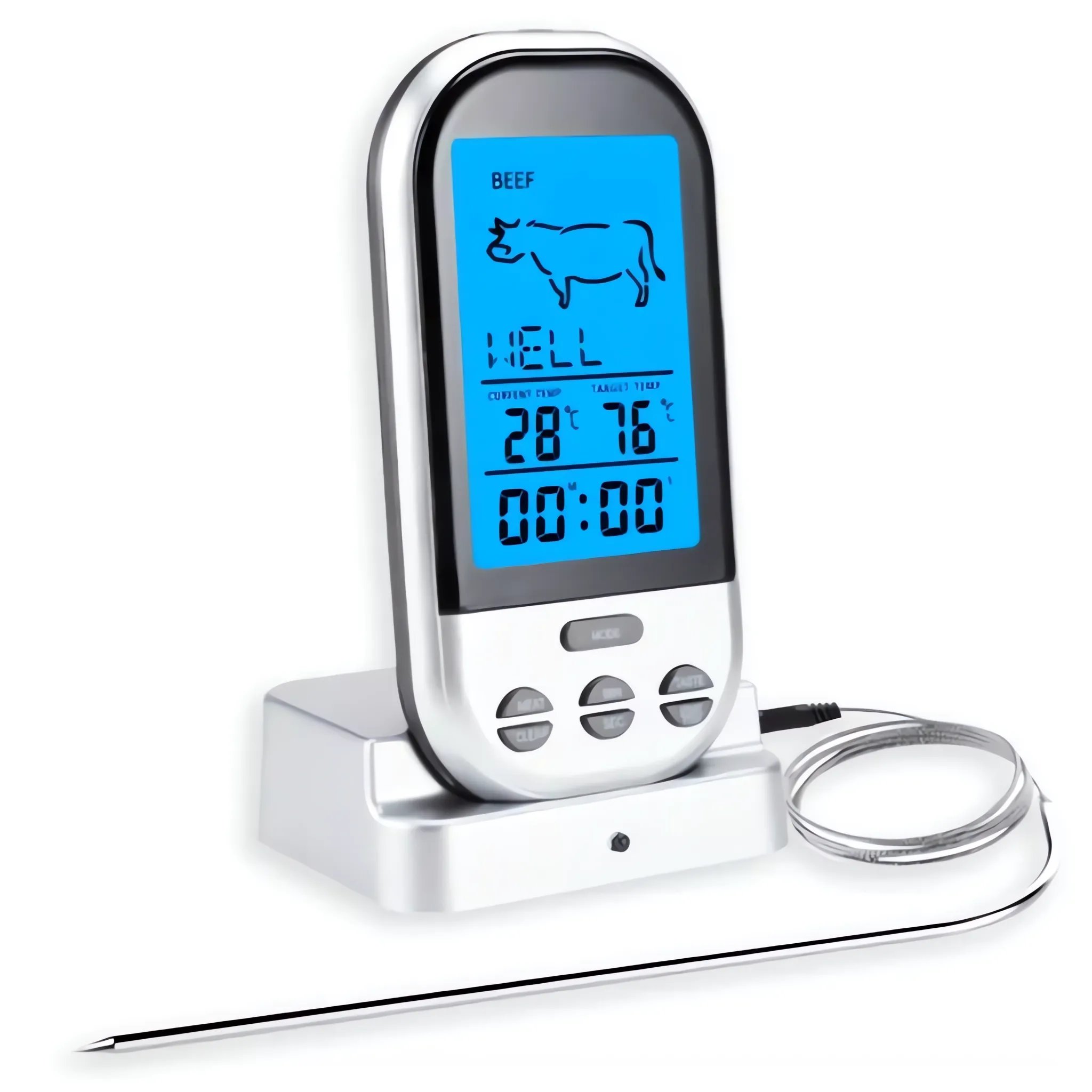 Na přístroji lze nastavit druh masa a jednotku měření (Celsius/Fahrenheit). Praktické podsvícení displeje vám pomůže nastavit multifunkční kuchyňský teploměr.