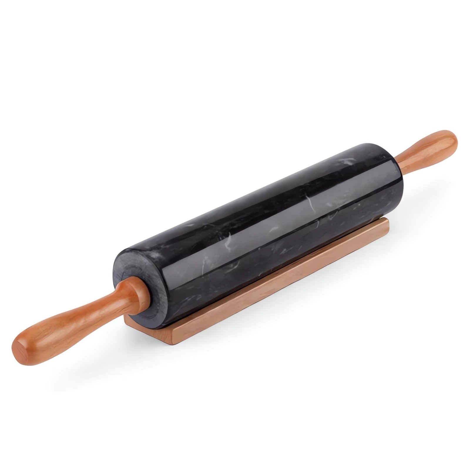 Mramorový váleček s dřevěnými rukojeťmi a podložkou.