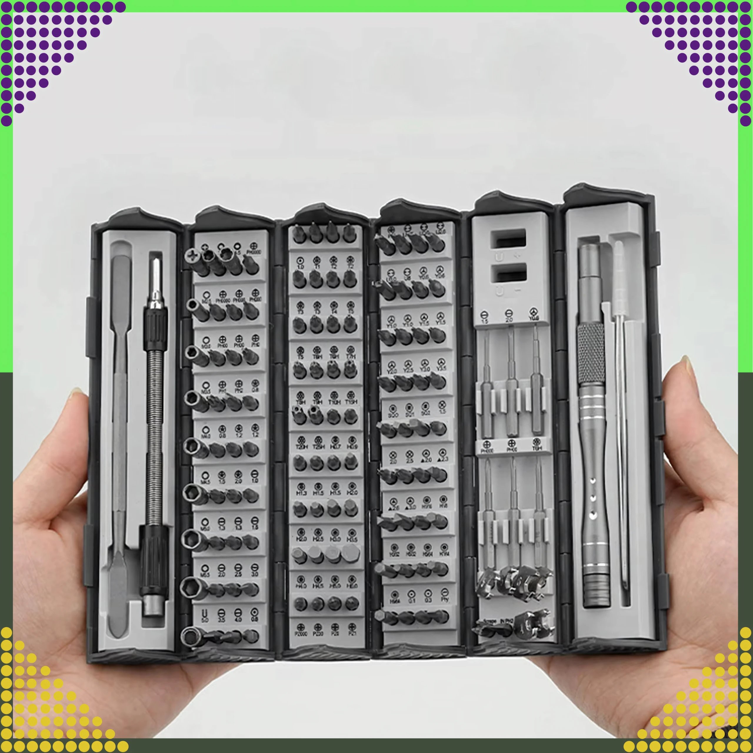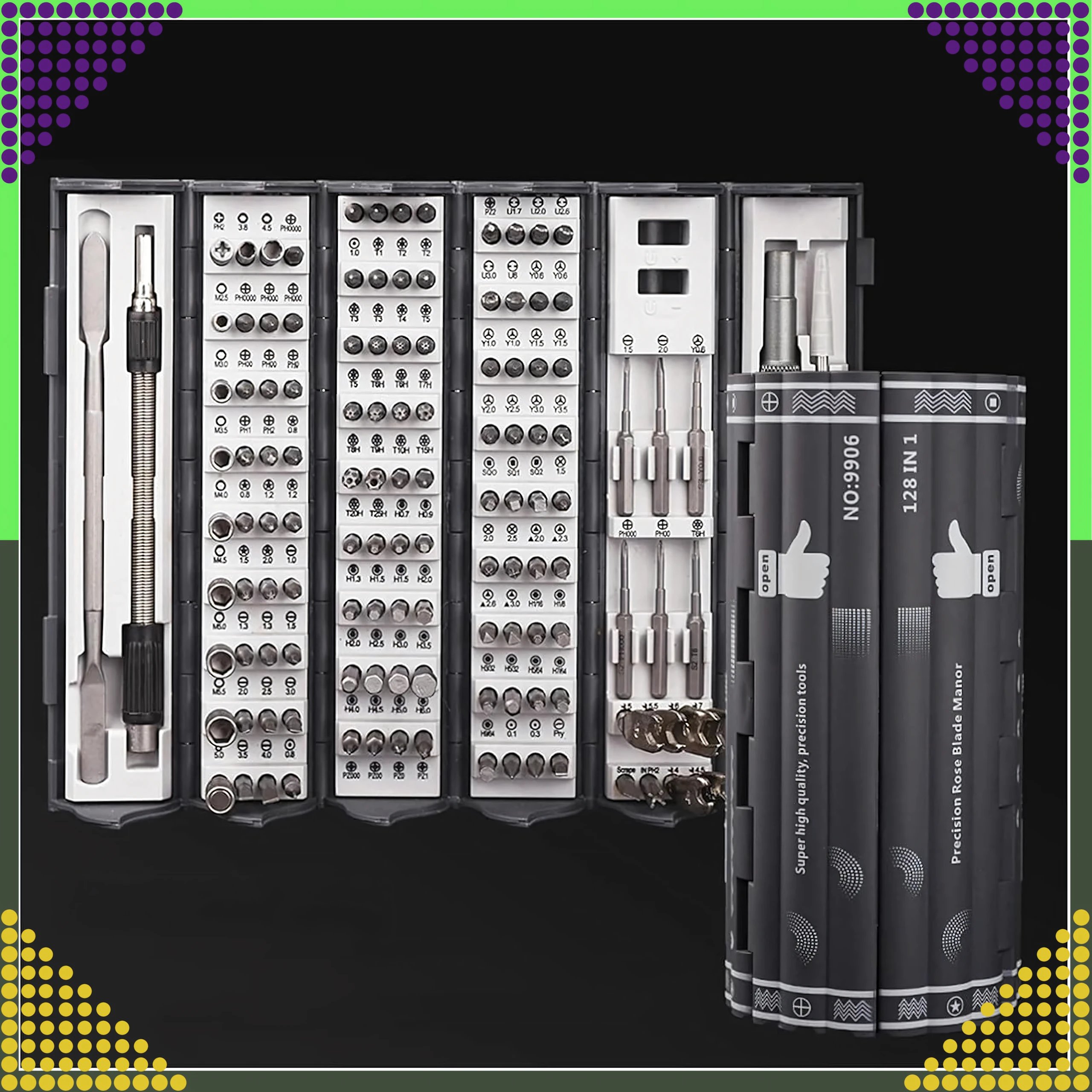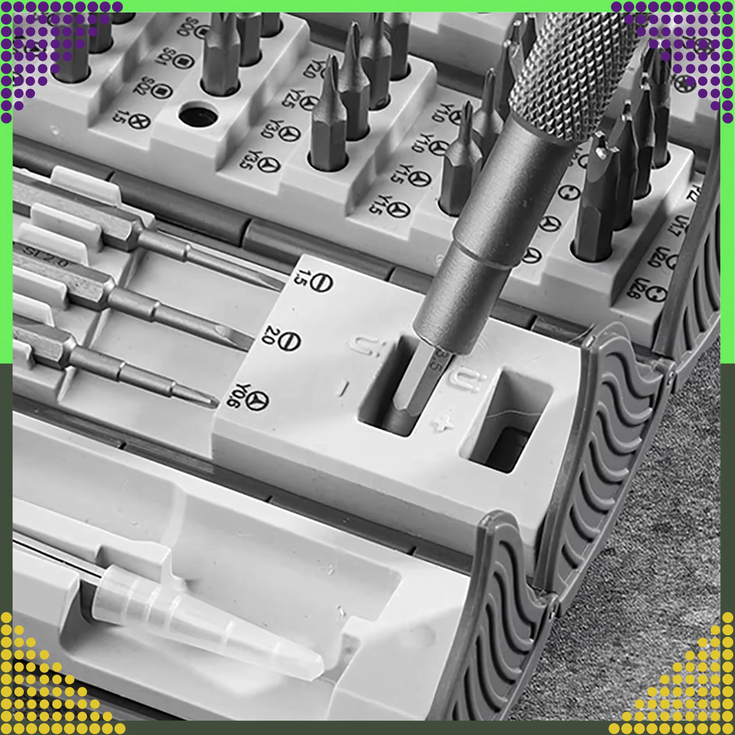 Univerzální 128dílná sada RealG pro precizní práce v elektronice i domácích opravách. Magnetické koncovky zajišťují jistý úchop šroubků a pohodlnou manipulaci i v těsných místech. Díky široké škále přesných bitů a praktickému příslušenství je set vhodný pro telefony, laptopy, hodinky, brýle, fotoaparáty, drobná zařízení a další každodenní servisní úkoly. Vše je přehledně uloženo v plastovém organizéru s futrálem, který usnadňuje skladování i transport.