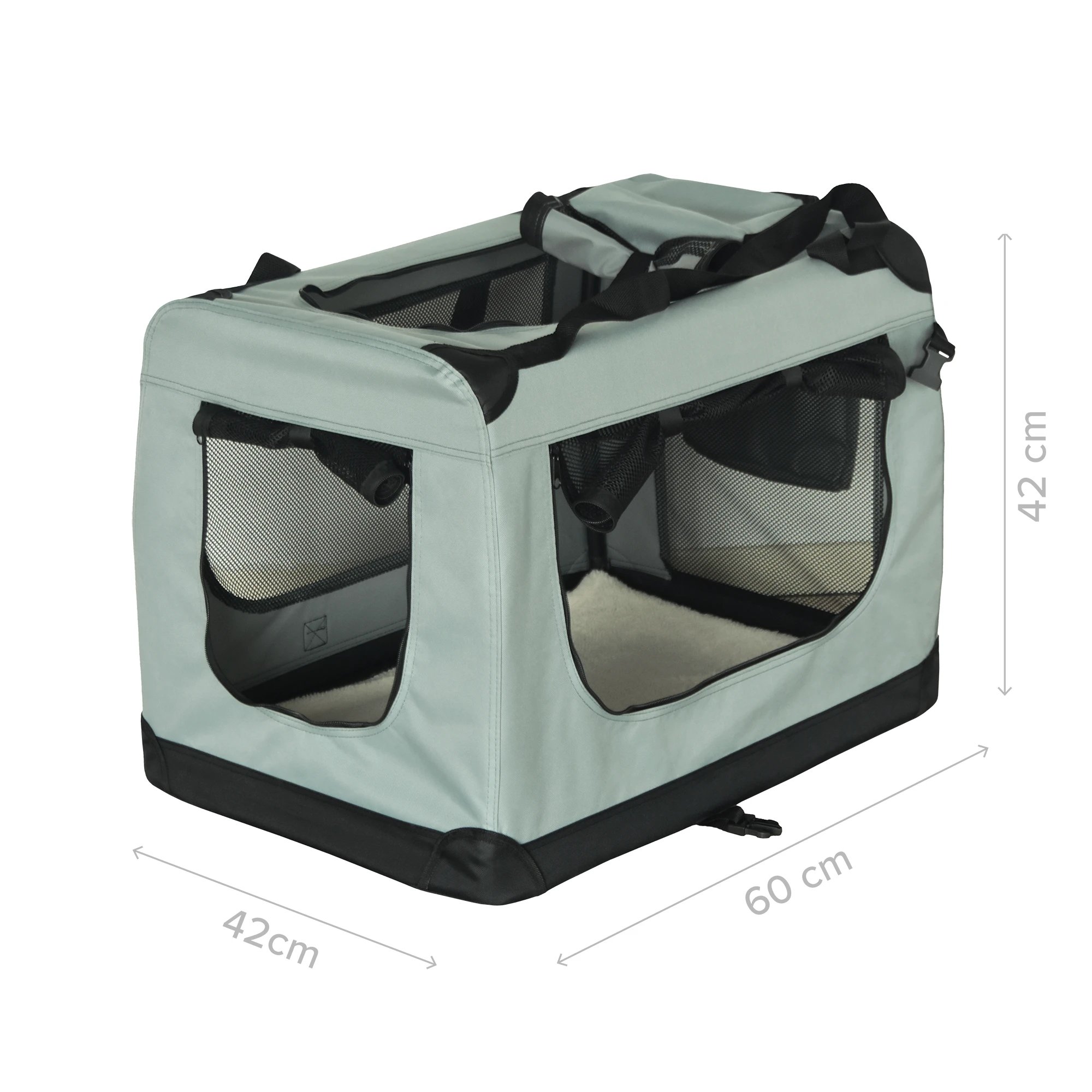 Skládací přepravní box pro zvířata s větráním, 3 vstupy a měkkou podložkou. Rozměry 60×42×42 cm.