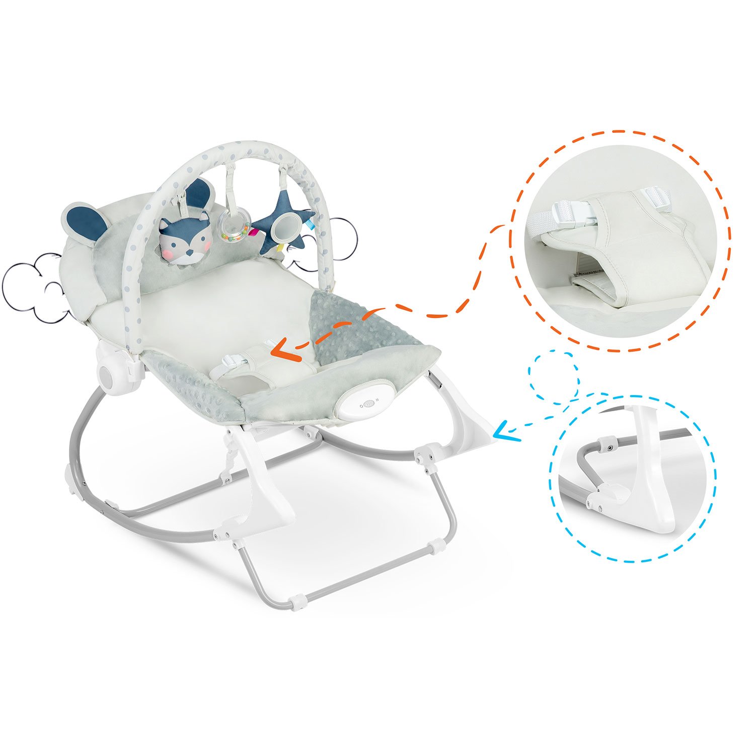 Lehátko nabízí režim uklidňujících vibrací – stačí jej zapnout a položit dítě do pohodlné polohy. Povlak je snadno snímatelný a lze jej prát ručně, což usnadňuje udržování hygieny. Hrazdičku lze sejmout a hračky díky suchým zipům libovolně odepínat, prohazovat nebo nahradit oblíbenými mazlíčky dítěte. Součástí je měkký odnímatelný polštářek s oušky. Konstrukce kombinuje kovový rám a odolný plast. Produkt je zcela bezpečný pro děti a splňuje všechny požadavky v EU. Praktická je i blokace houpání a 2stupňová regulace sklonu opěrky.