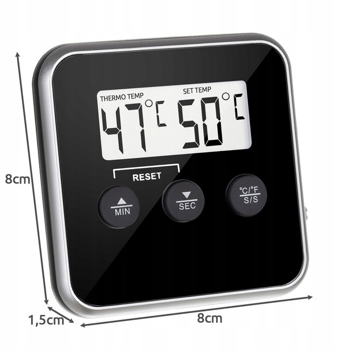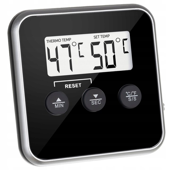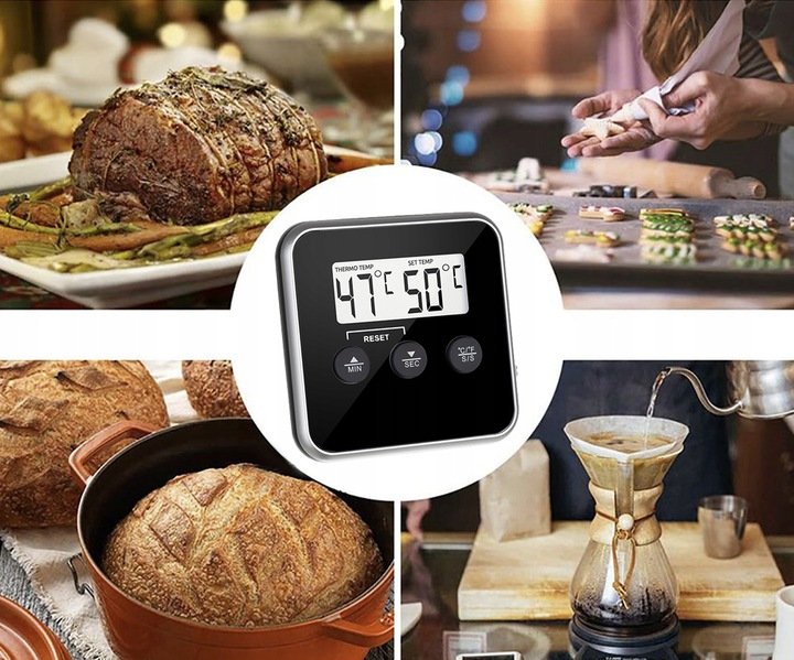 Teploměr má sondu vyrobenou z nejkvalitnější nerezové oceli, s vysokou odolností proti poškrábání, promáčknutí či jinému mechanickému poškození, ale také proti vysokým teplotám. Na krytu teploměru je intuitivní ovládací panel. Zařízení má funkci času uzamčení - určeno pro nepřetržité sledování teploty a časovač se zvukovým signálem. Pracuje v rozsahu od 0 do 300 stupňů Celsia s jedním skokovým krokem. Tepelně odolná nerezová sonda je umístěna na konci dlouhého a pohodlného kabelu.